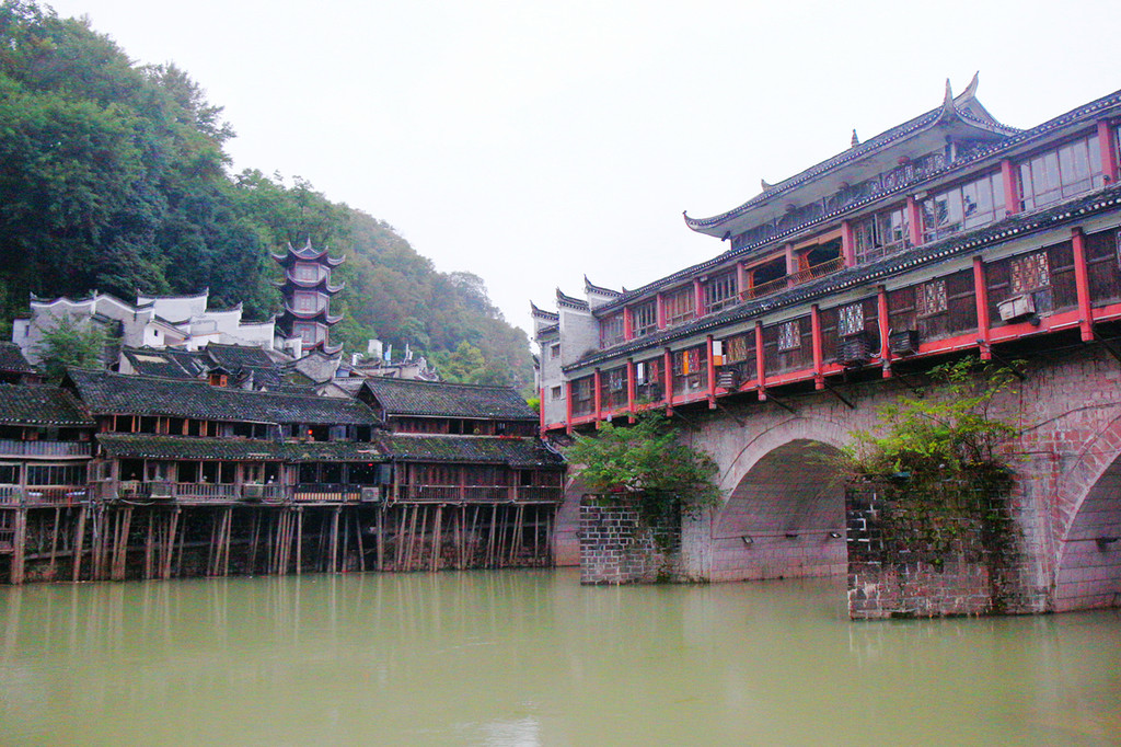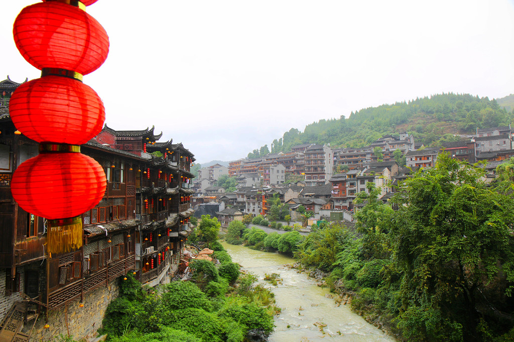 下午13:00左右,我们抵达了芙蓉镇。这完全是因为一部同名电影而广为人知的地方,本名王村,后为扩大旅游而改为芙蓉镇,是一座拥有两千多年历史的古镇,因宏伟瀑布穿梭其中,又称“挂在瀑布上的千年古镇”。