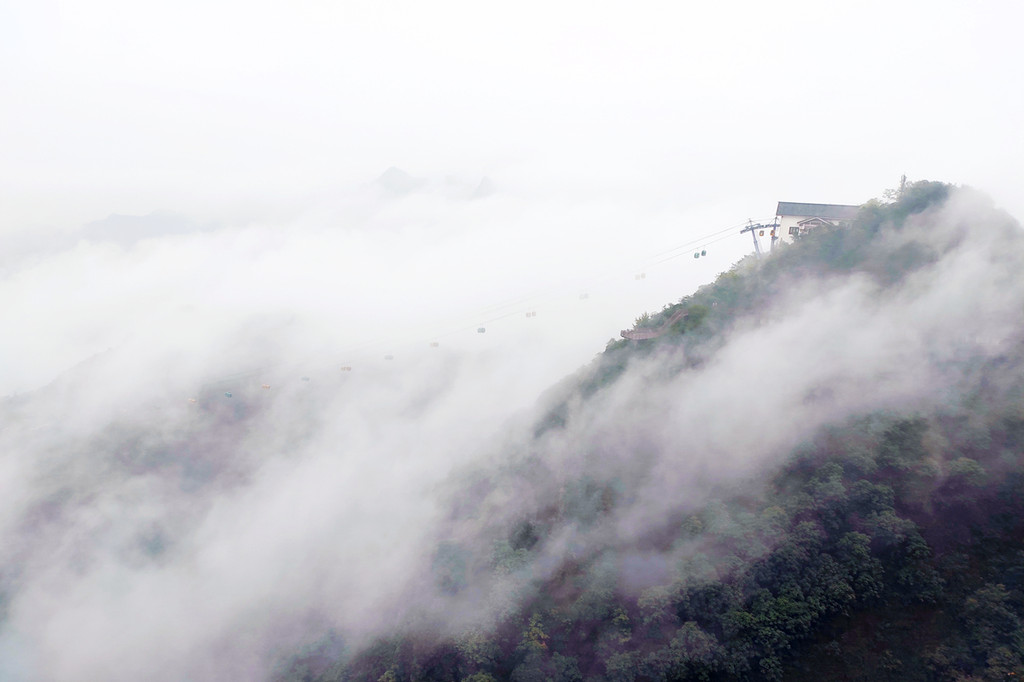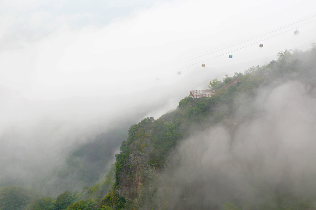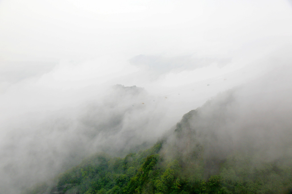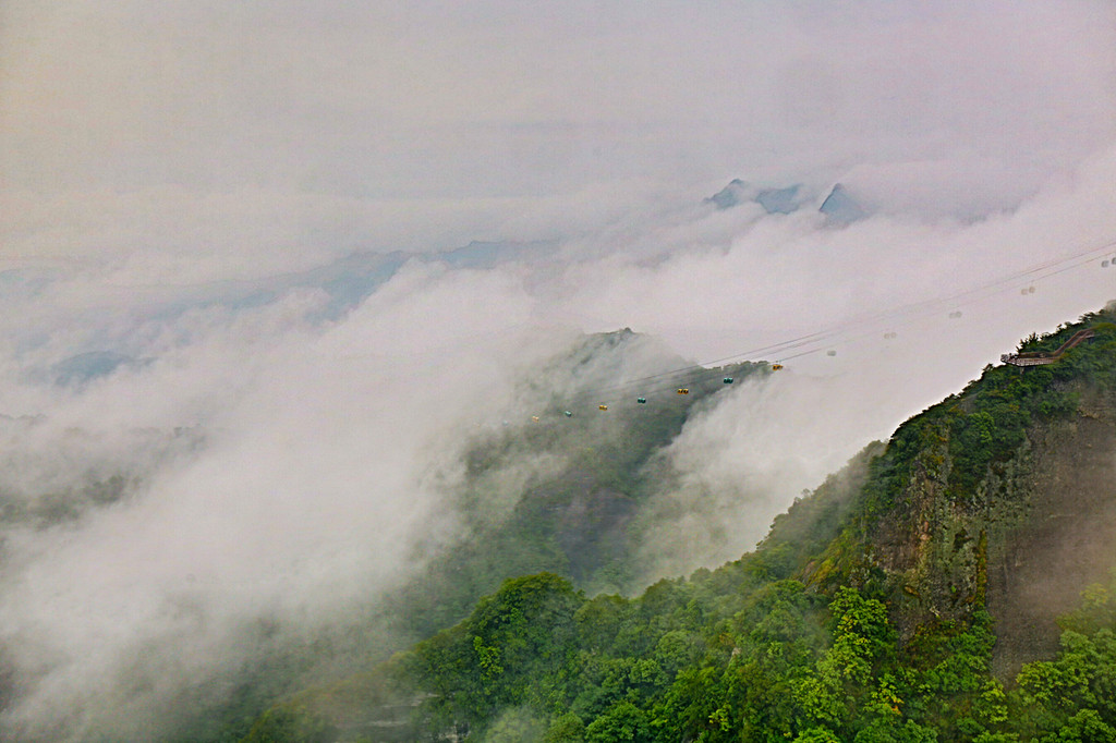 提前联系的私导把优惠索道票(66元)送了上来,随着索道高度的降低,雾气开始消散,山峰渐渐裸露了出来。