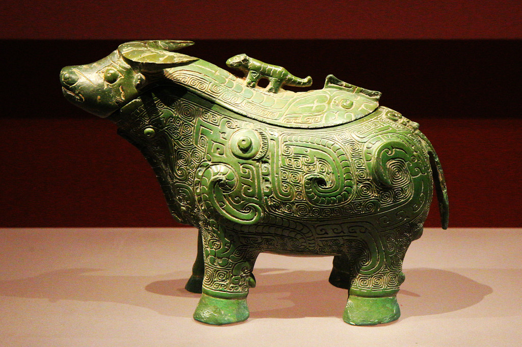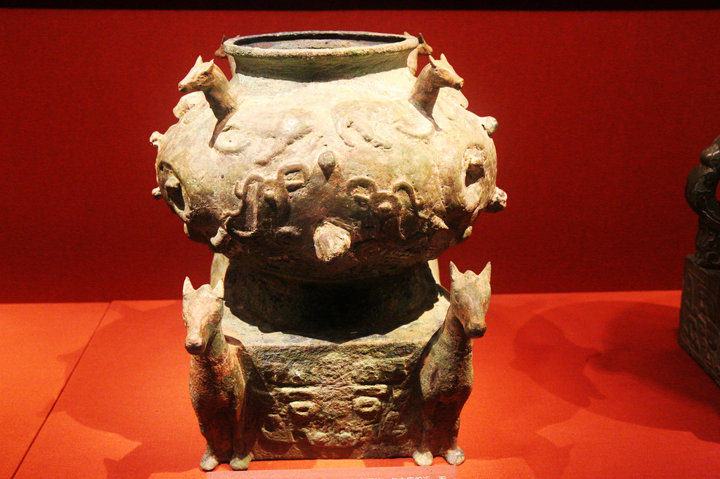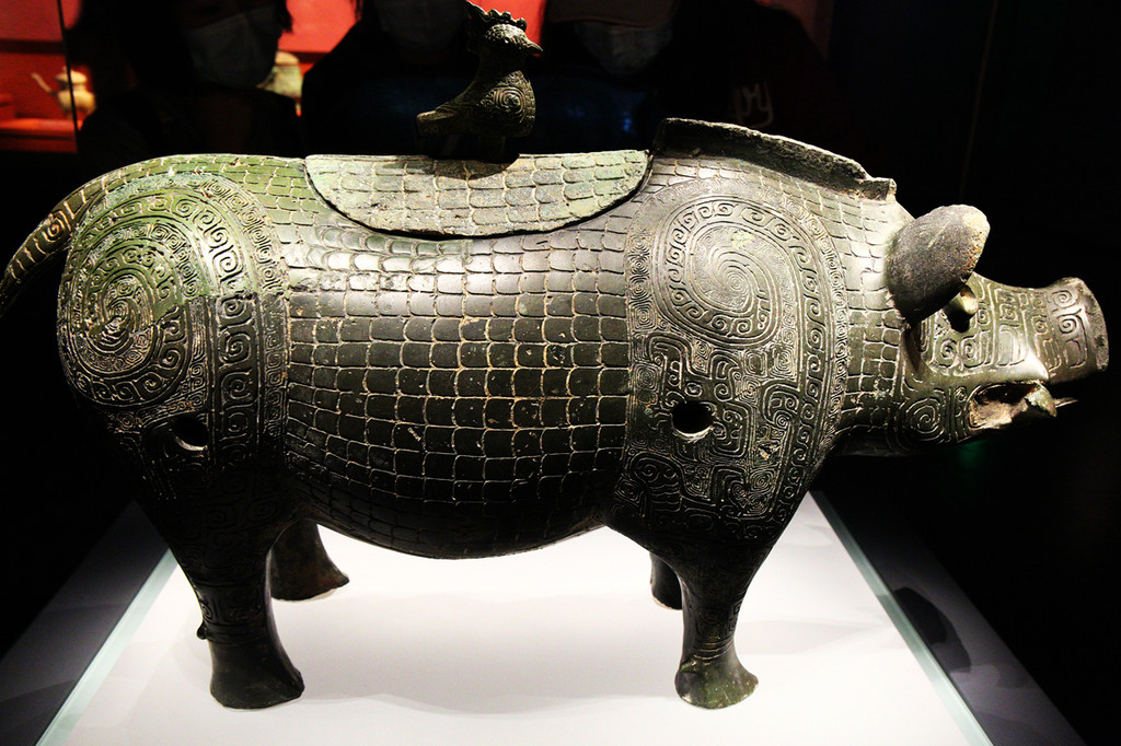 商代豕形铜尊,出土于湘潭九华船形山。猪尊作野公猪形状,有盖,盖上捉手残缺,根据残存情况复原成凤鸟形。双眼直视,獠牙外露,两耳竖立,四肢粗壮,尾下垂。肘部前后各有一圆形管孔,经过尊腹,直通到另一肘。