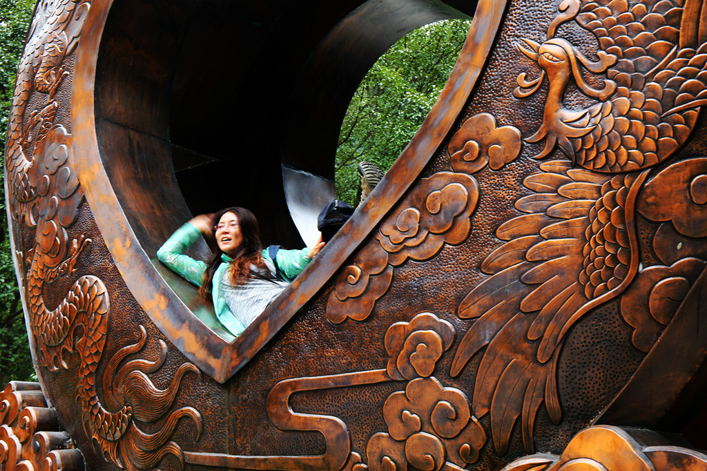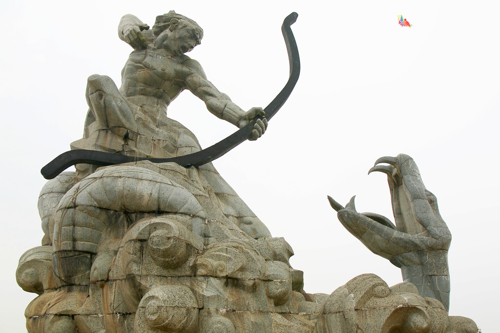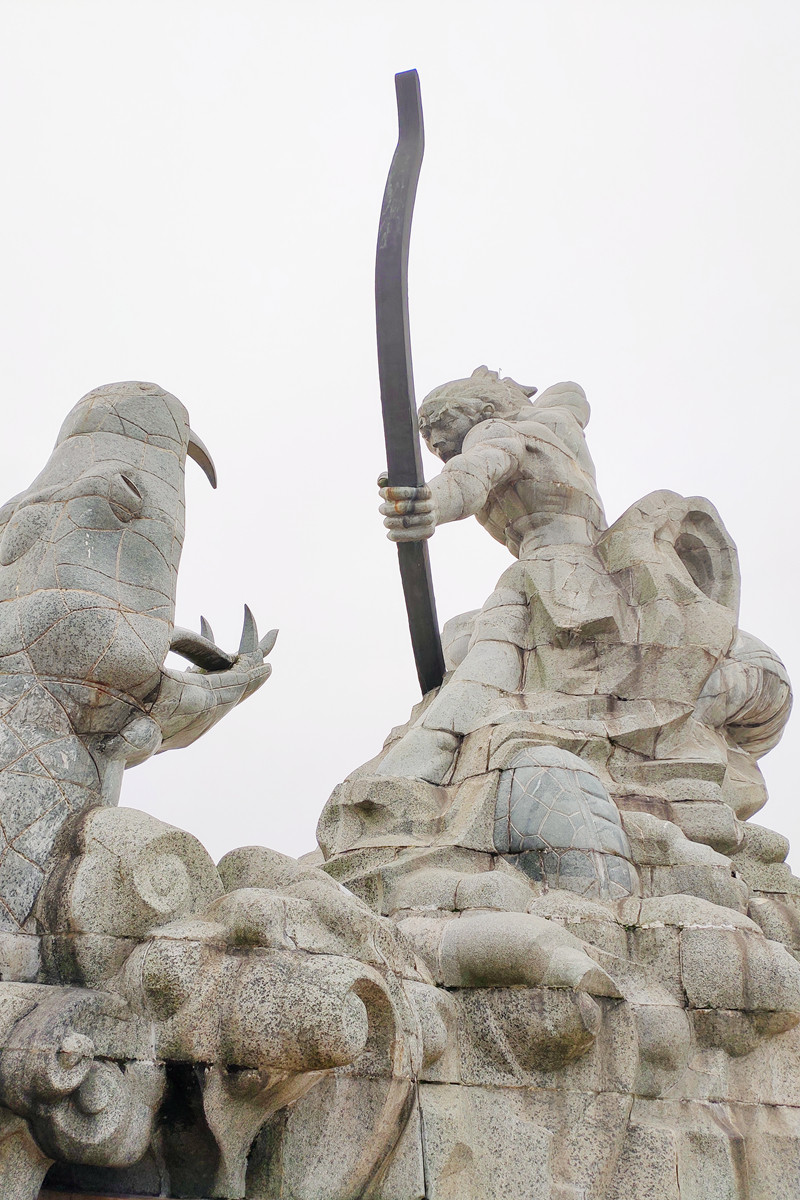 从岳阳楼出来后,我们沿着湖边城墙,一直走到洞庭湖广场。这里有一尊巨大而精美的后羿射巴蛇的雕塑。
