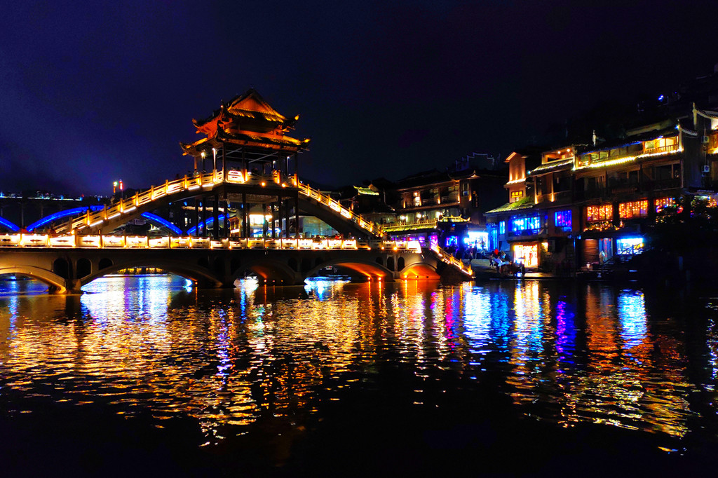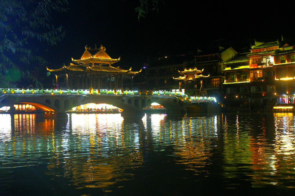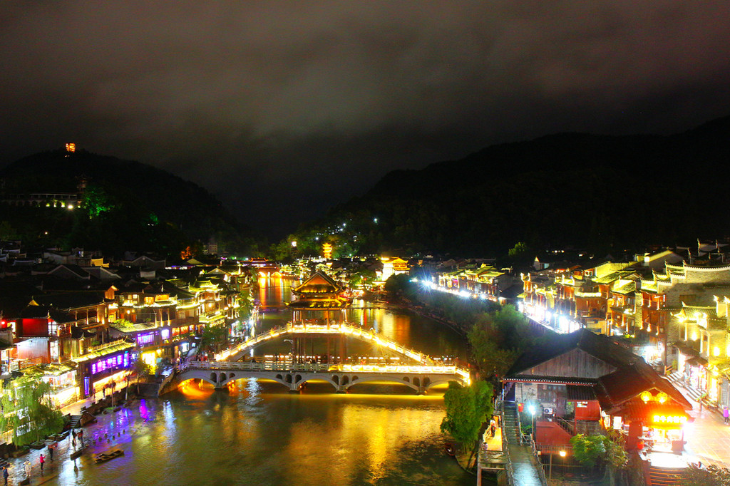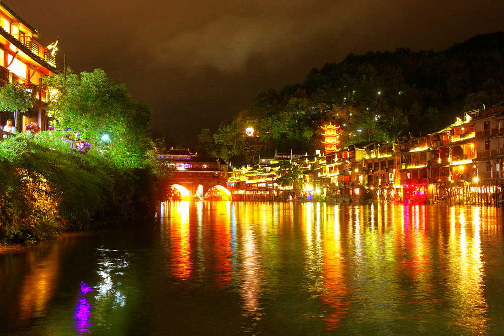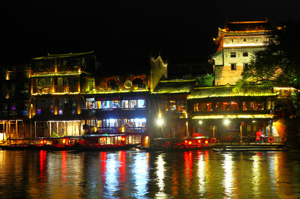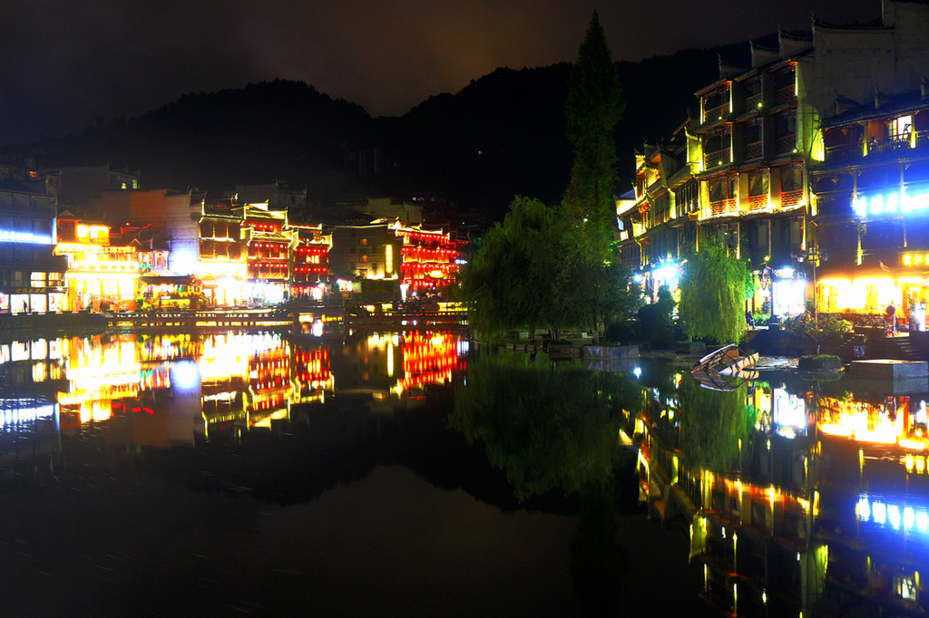 凤凰的夜景天下闻名,为了专心拍摄,我们几人分头行动,各取所需。走在江岸上,脚边就是滔滔的江水,岸边灯红酒绿,酒吧里声音震耳欲聋,不时有人招呼说:“50块钱12瓶啤酒,不限时间”,真是诱惑满满。