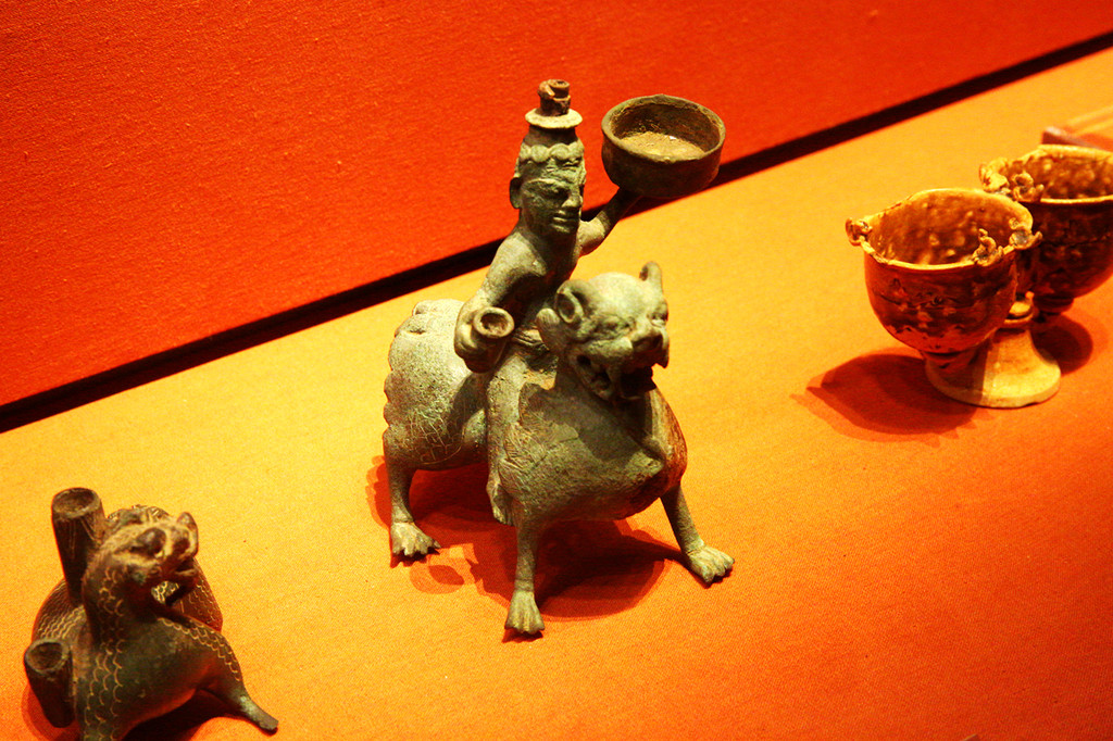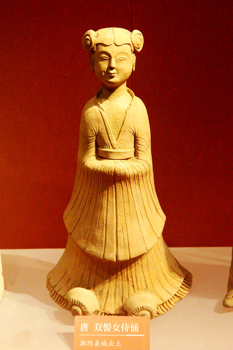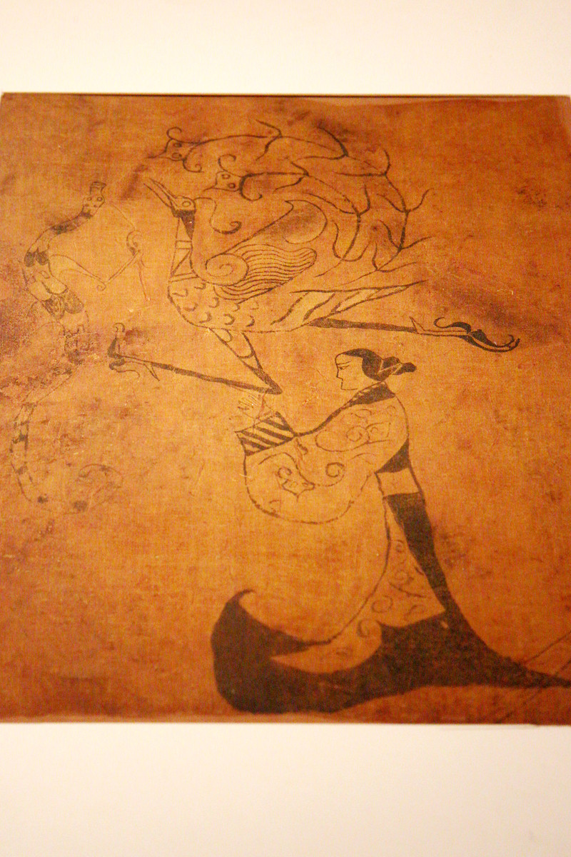 马王堆出土文物以纺织品、漆器、帛画等为主,进门处就是一个泥塑人偶,是辛追夫人墓出土。