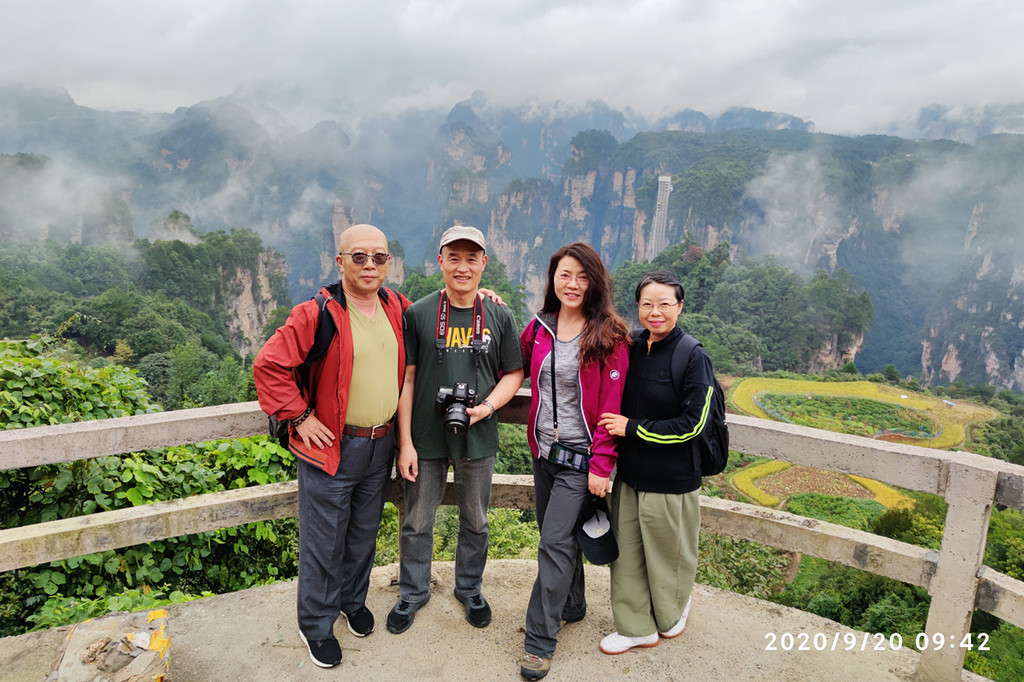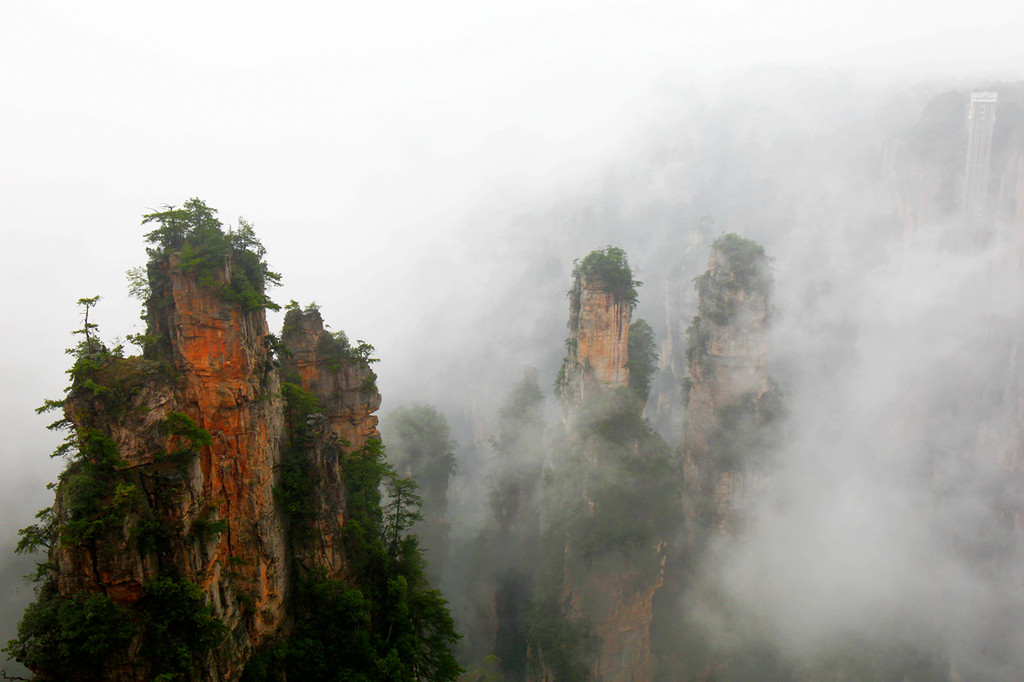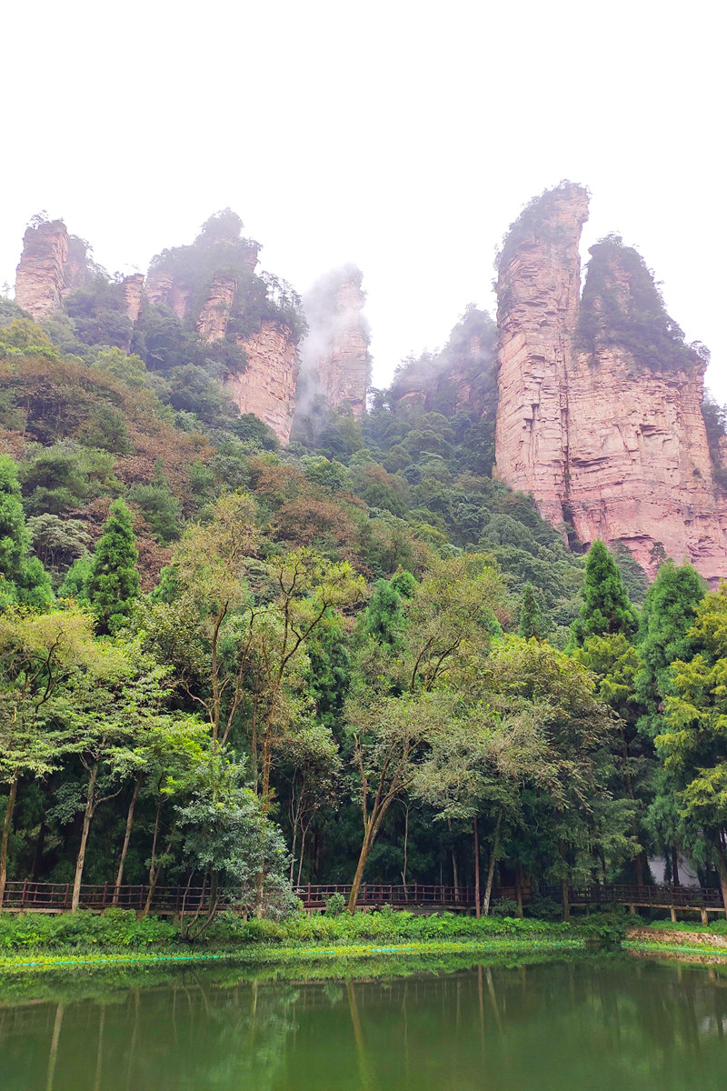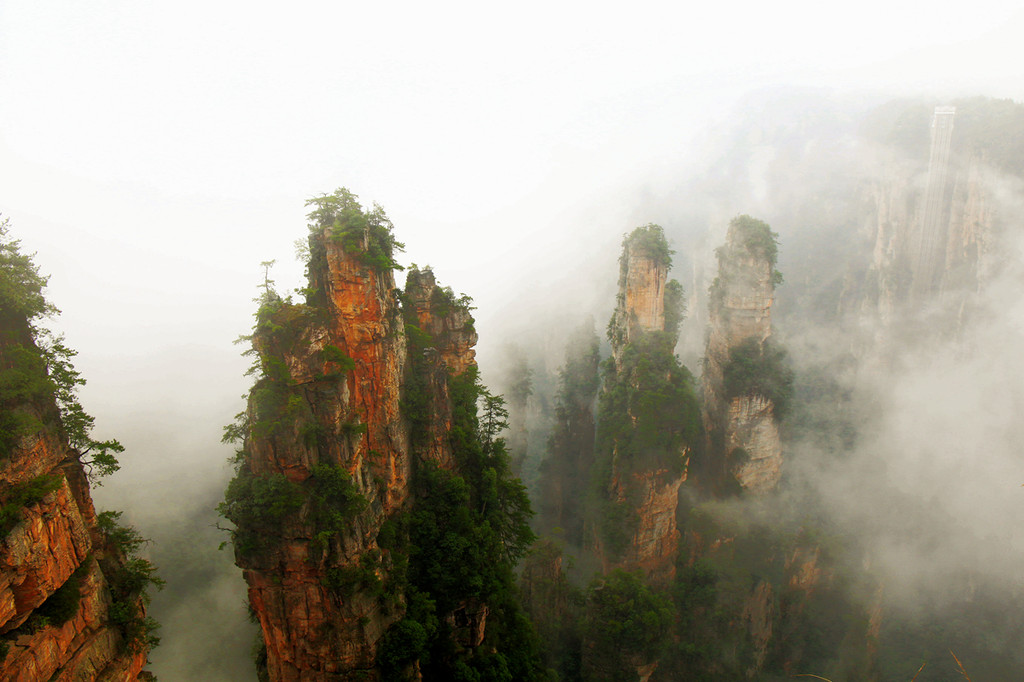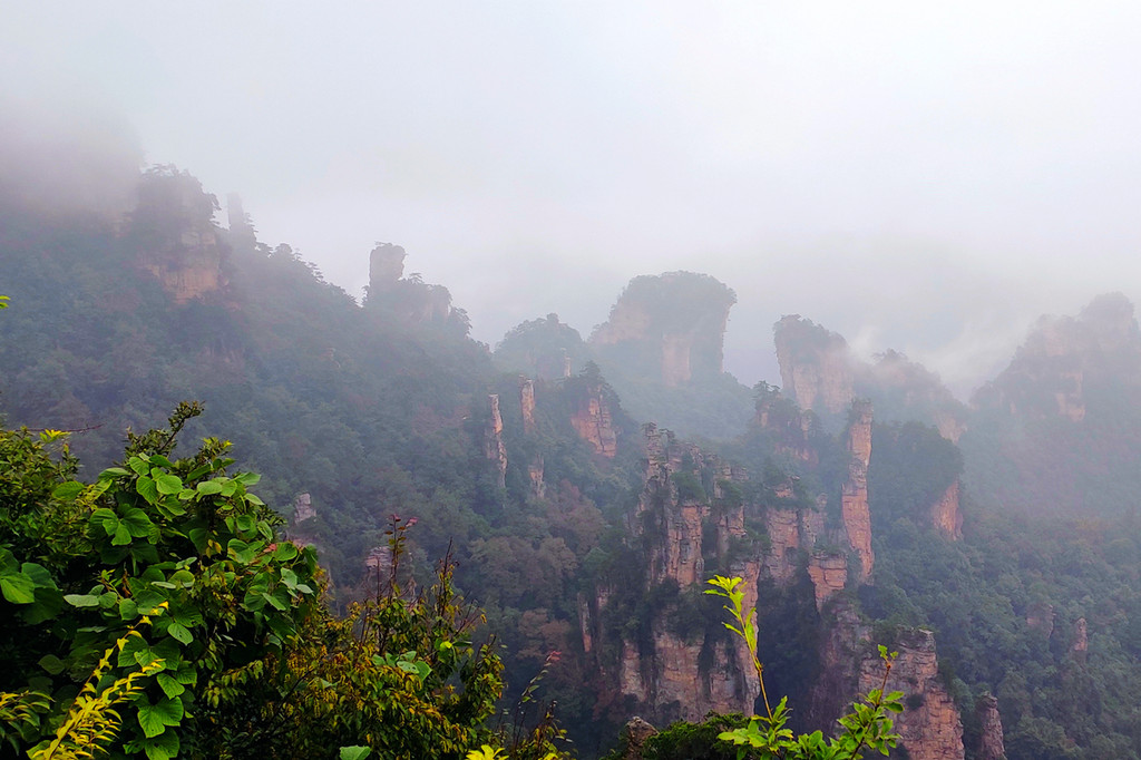 我们的运气简直爆棚,不但看见了张家界独特的峰林,还遇见了难得一见的云雾,对面的百龙天梯若隐若现。
