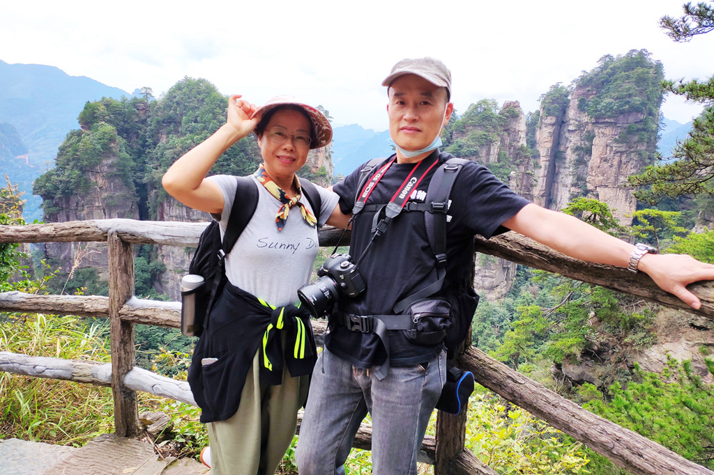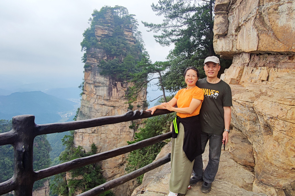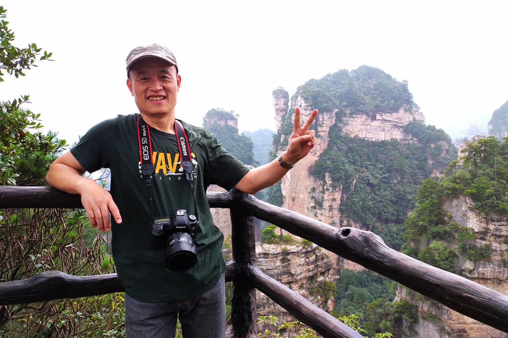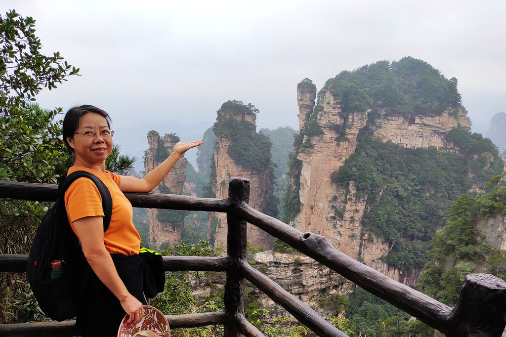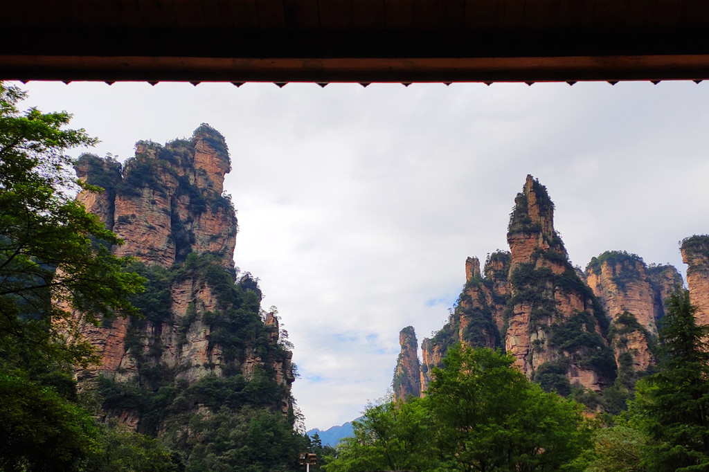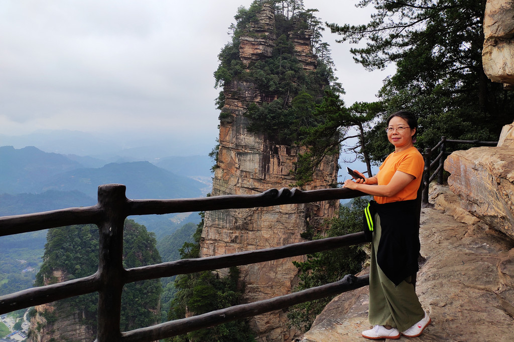 我们的运气简直爆棚,不但看见了张家界独特的峰林,还遇见了难得一见的云雾,对面的百龙天梯若隐若现。