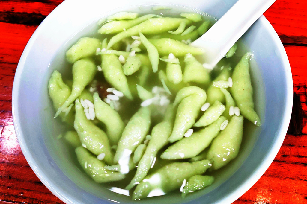 米豆腐形如纺锤,色泽润绿明亮,口感清香、软滑细嫩,原料采用普通籼米磨碎,制作的关键是生石灰的加入量,多了口涩,少了味淡。