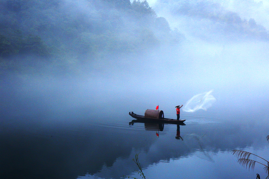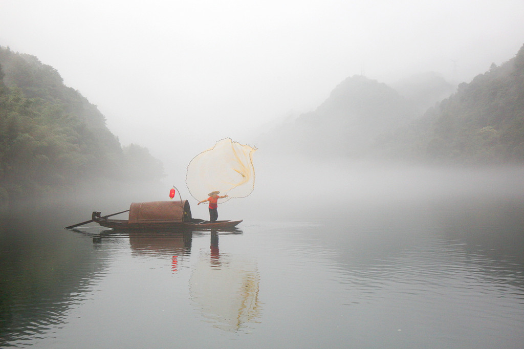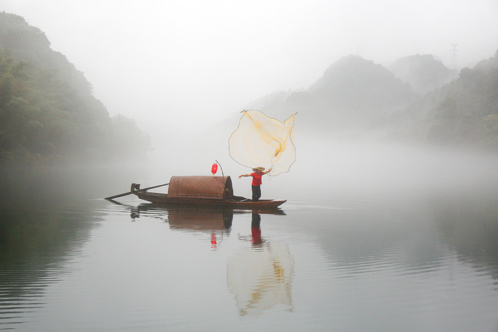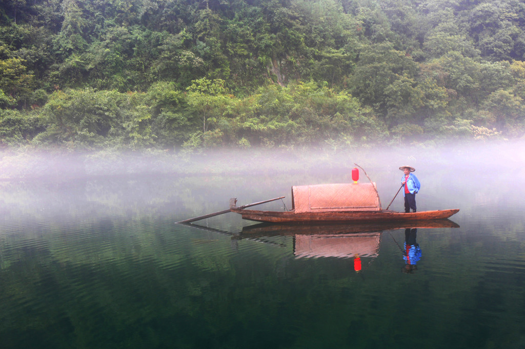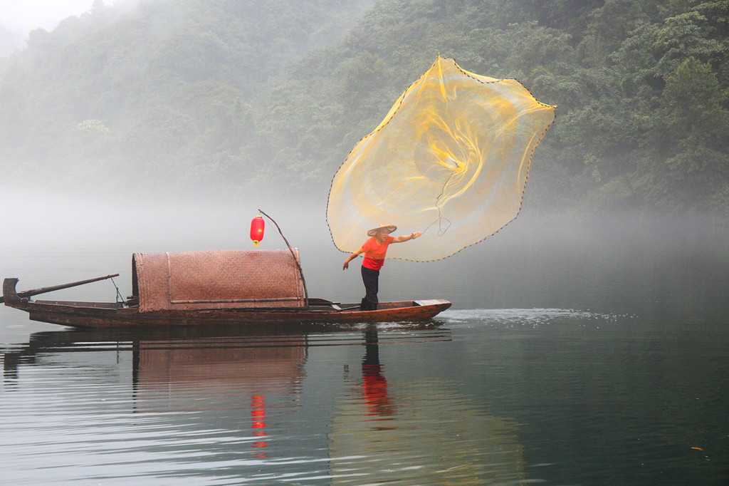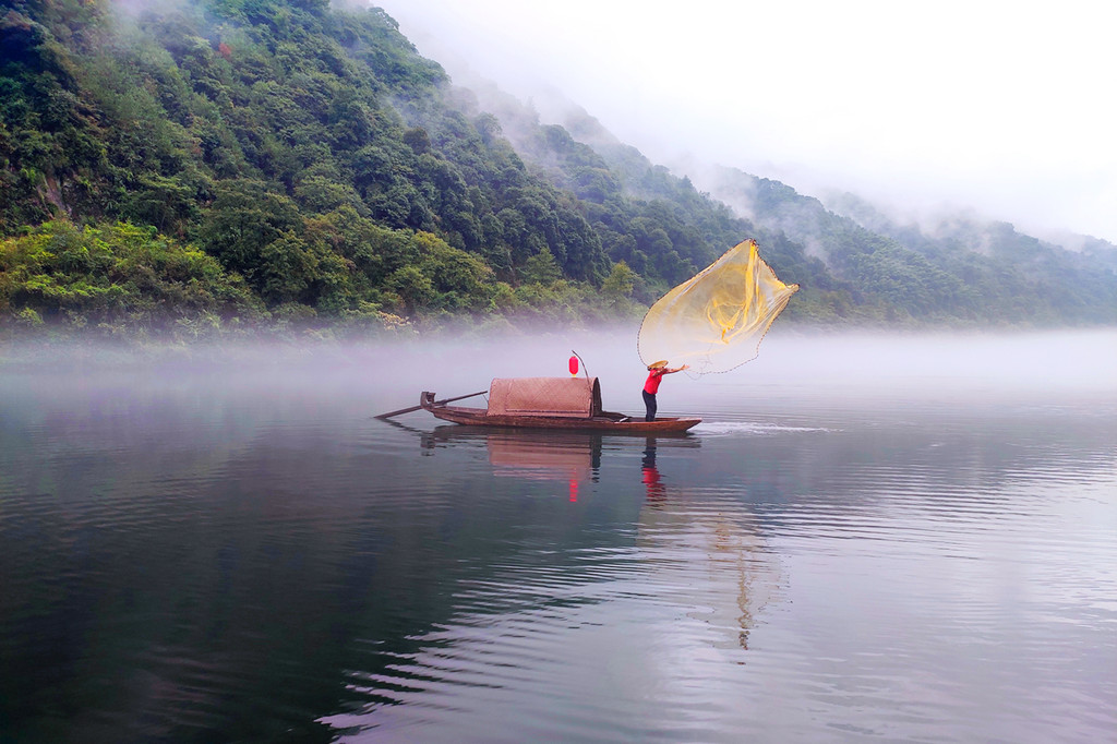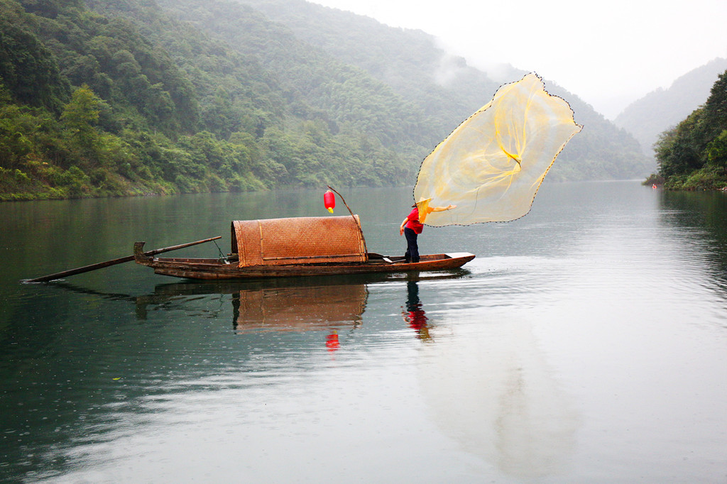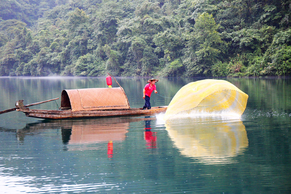 为了吸引游客,景区雇佣了专业渔夫,穿上鲜艳的衣服,戴上斗笠,在主要观景台表演撒网,其实大家都知道,小东江水冷且深邃,根本捕不到鱼,就是摆摆样子罢了。