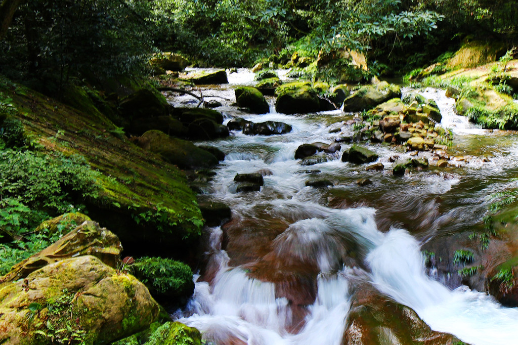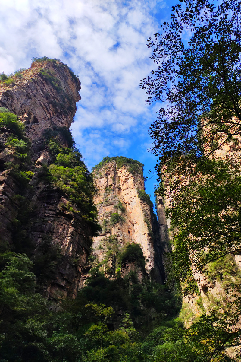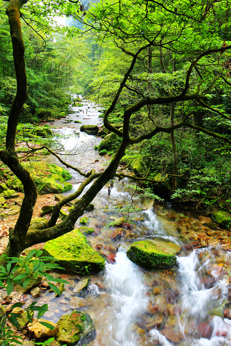 午后的阳光透过树木斑斑驳驳地照射下来,树梢上的天空湛蓝通透,白云悠悠,真是“清清流水青青山,山如画屏人如仙,仙人若在画中走,一步一望一重天”。