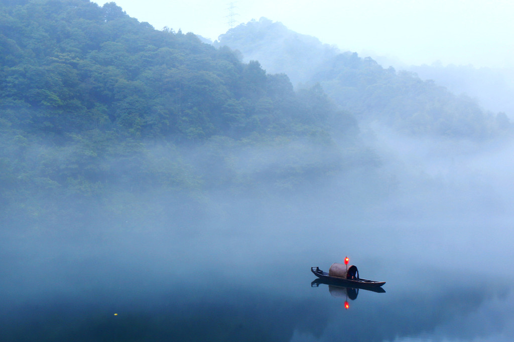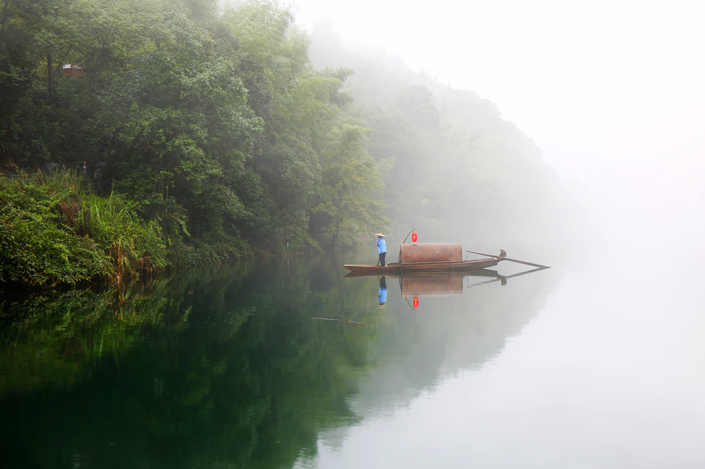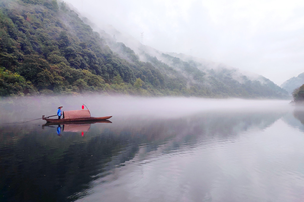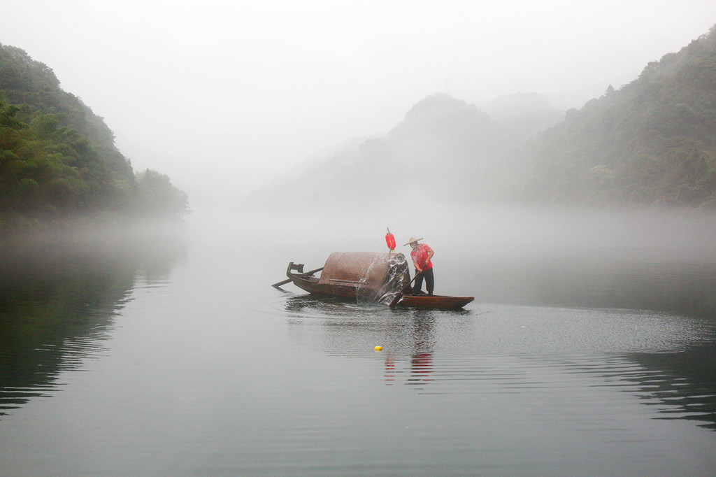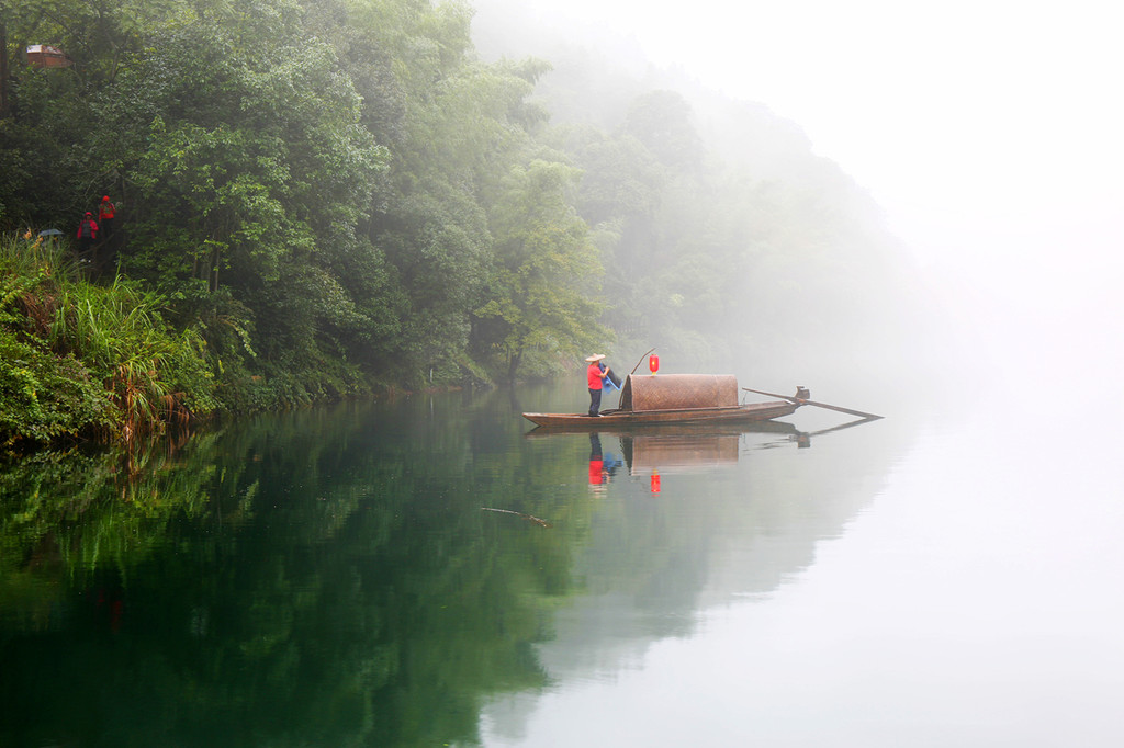 今早没有晨雾,天气阴沉,江两岸挤满了团队出游的客人,导游的声音叽叽喳喳好不热闹。