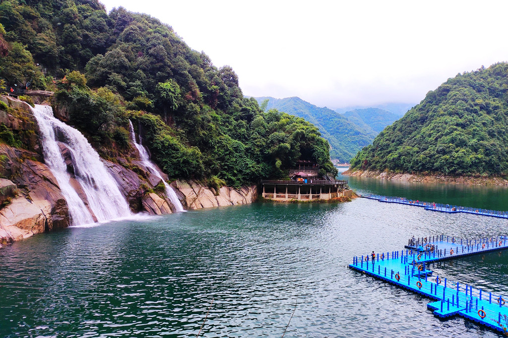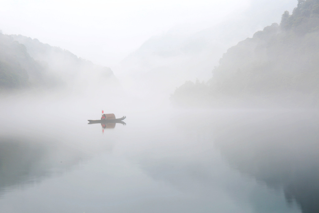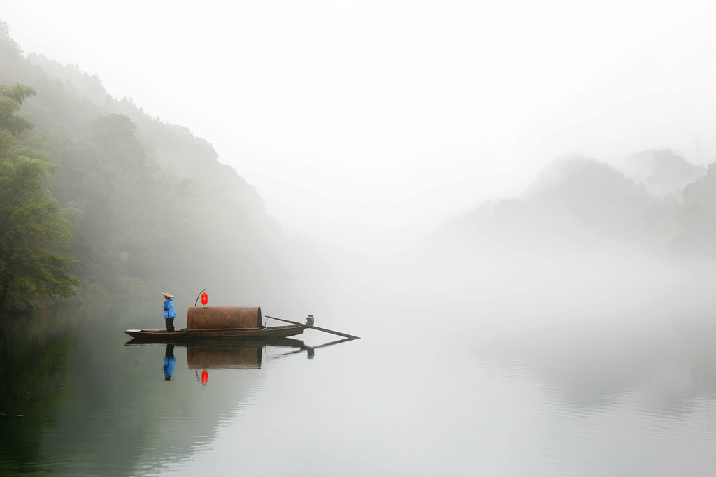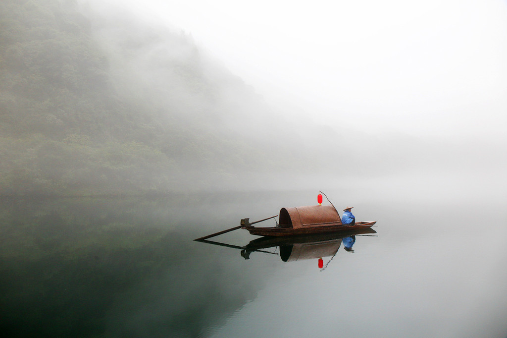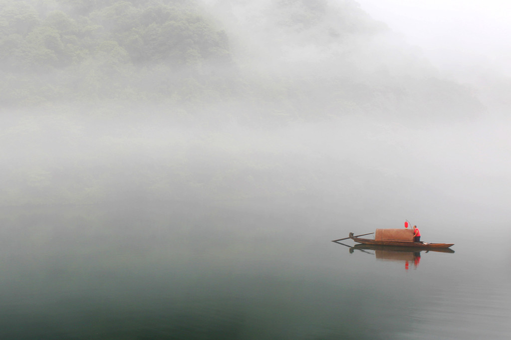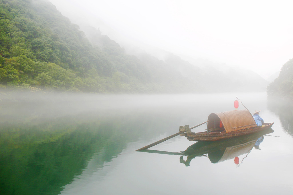 今早没有晨雾,天气阴沉,江两岸挤满了团队出游的客人,导游的声音叽叽喳喳好不热闹。