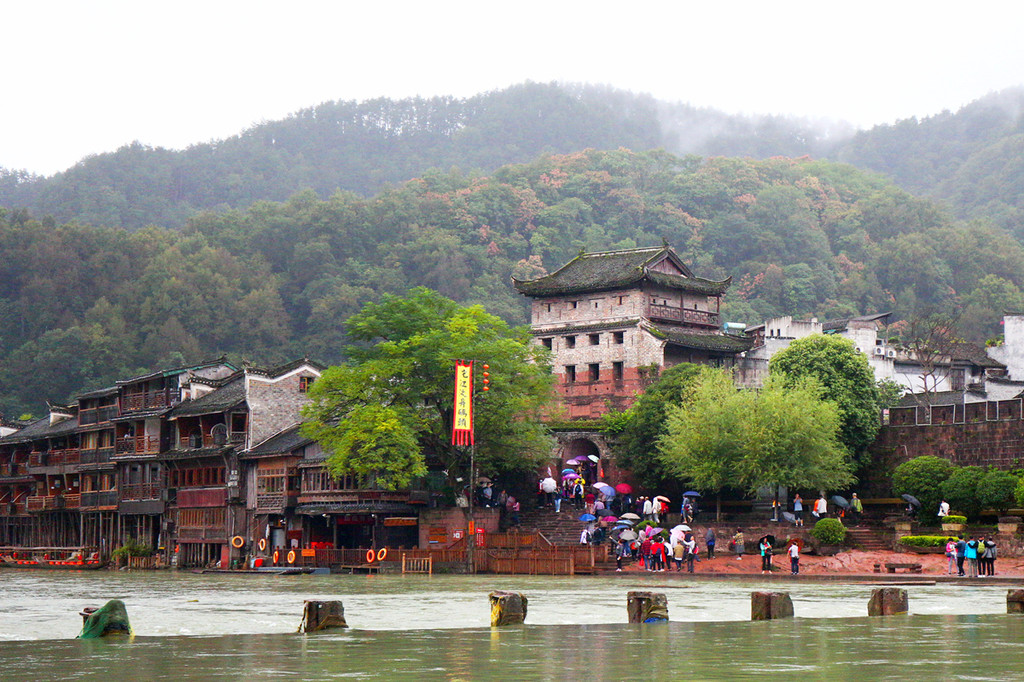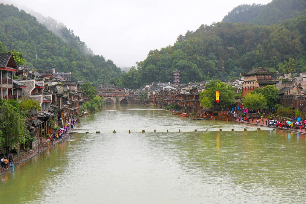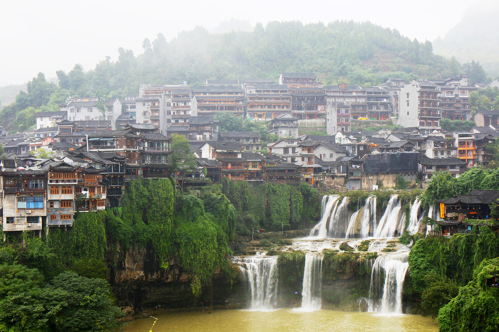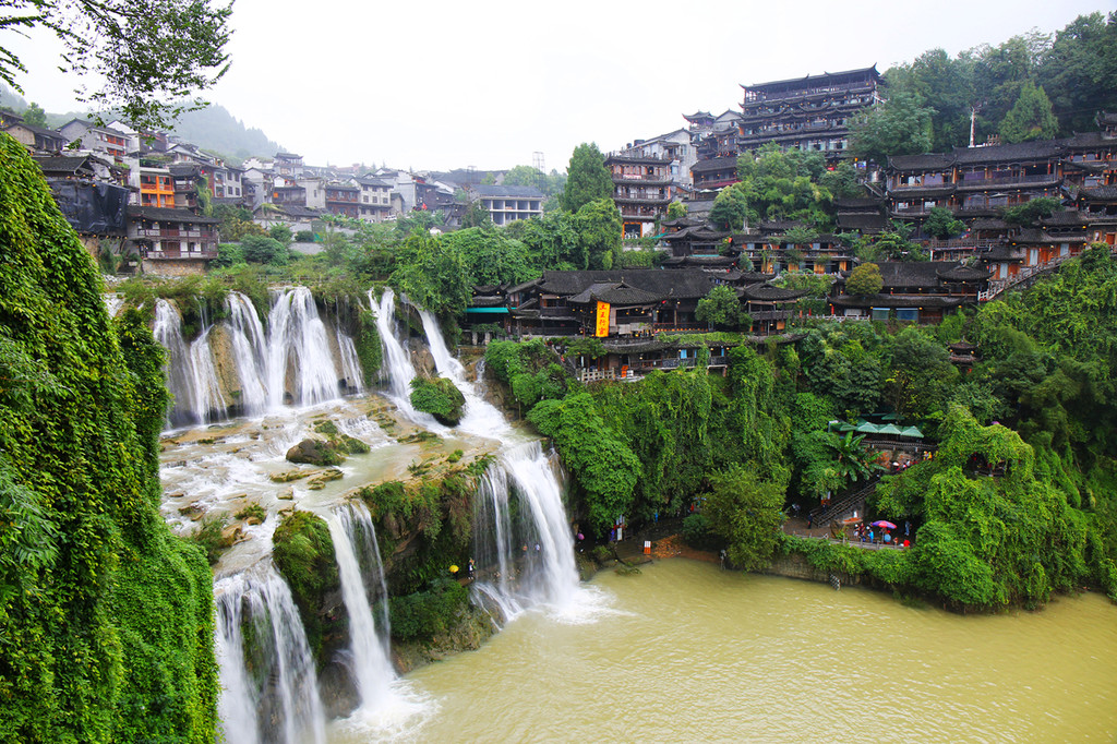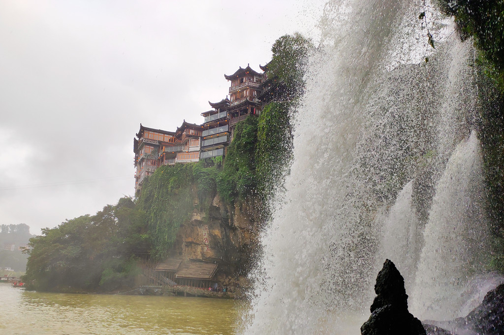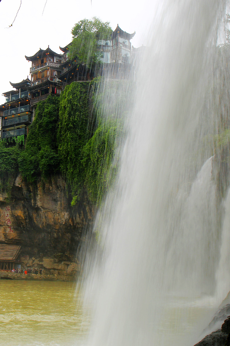 芙蓉镇三面环水,瀑布穿镇而过,别有洞天。这是湘西最大最壮观的一道瀑布,高60米,宽40米,分两级从悬崖上倾泻而下,声势浩大,方圆十里都可听见。