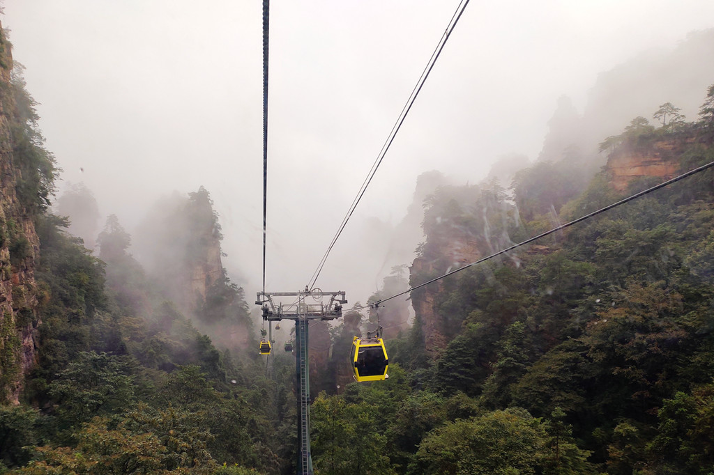 沿着雾气腾腾的石阶走了一段下坡,看看下面依然是深不见底的雾海,决定回头是岸,乘车前往杨家界索道站,返回森林公园大门。