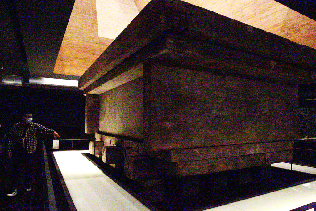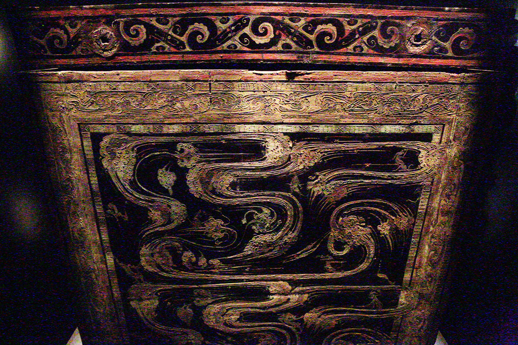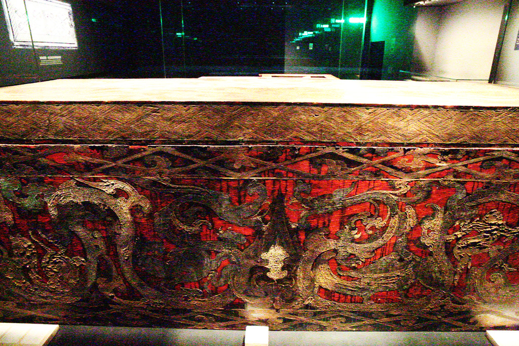 马王堆汉墓的出土棺椁,精美绝伦,博物馆模拟了发掘现场的情形,巨大的椁板让人叹为观止。