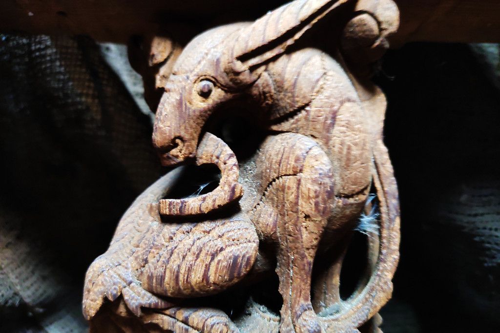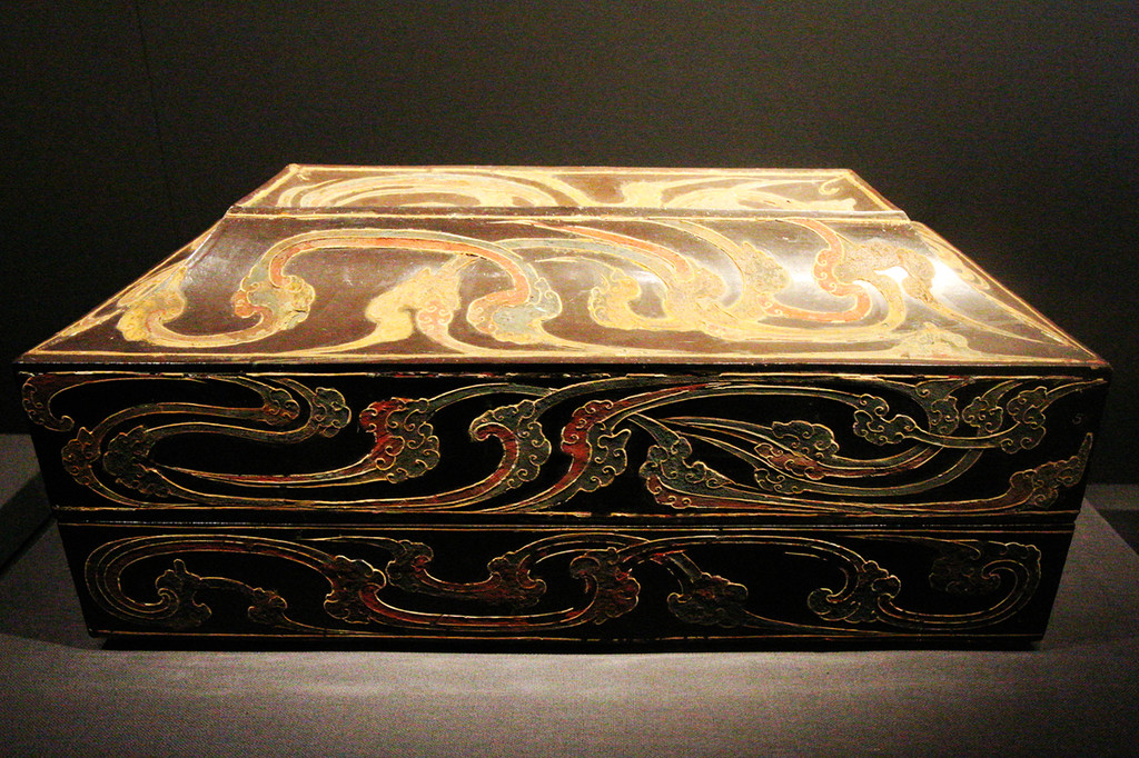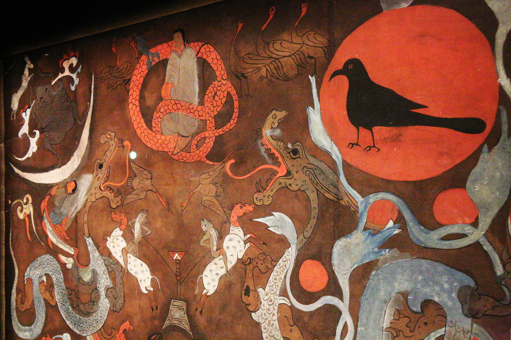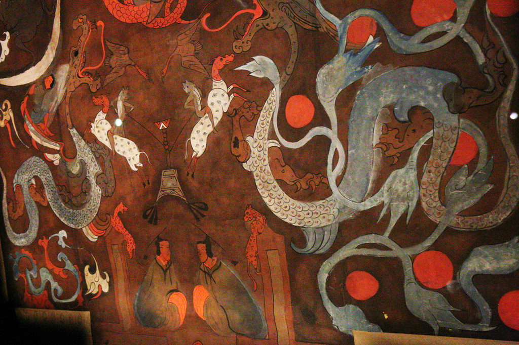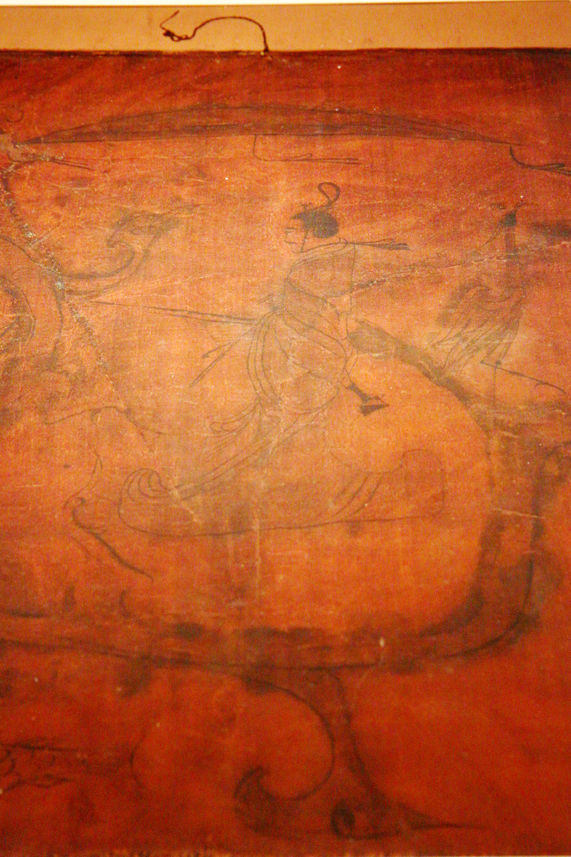 人物御龙帛画,长沙市子弹库一号墓出土,画面正中绘头戴高冠、身穿博袍、腰佩长剑的男子,当为墓主人形象。他侧身立于龙身,头顶一华盖;龙昂首卷尾,弓身成舟,舟尾立鹤。舟旁有一鲤鱼随行。