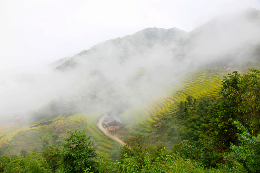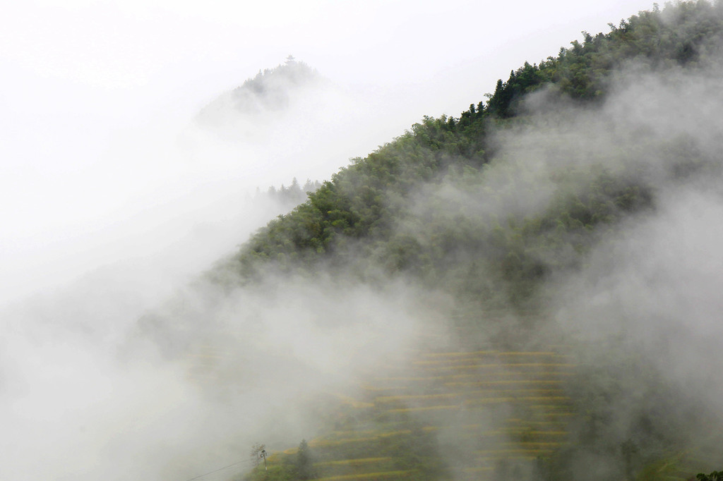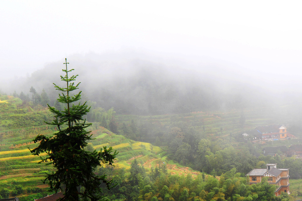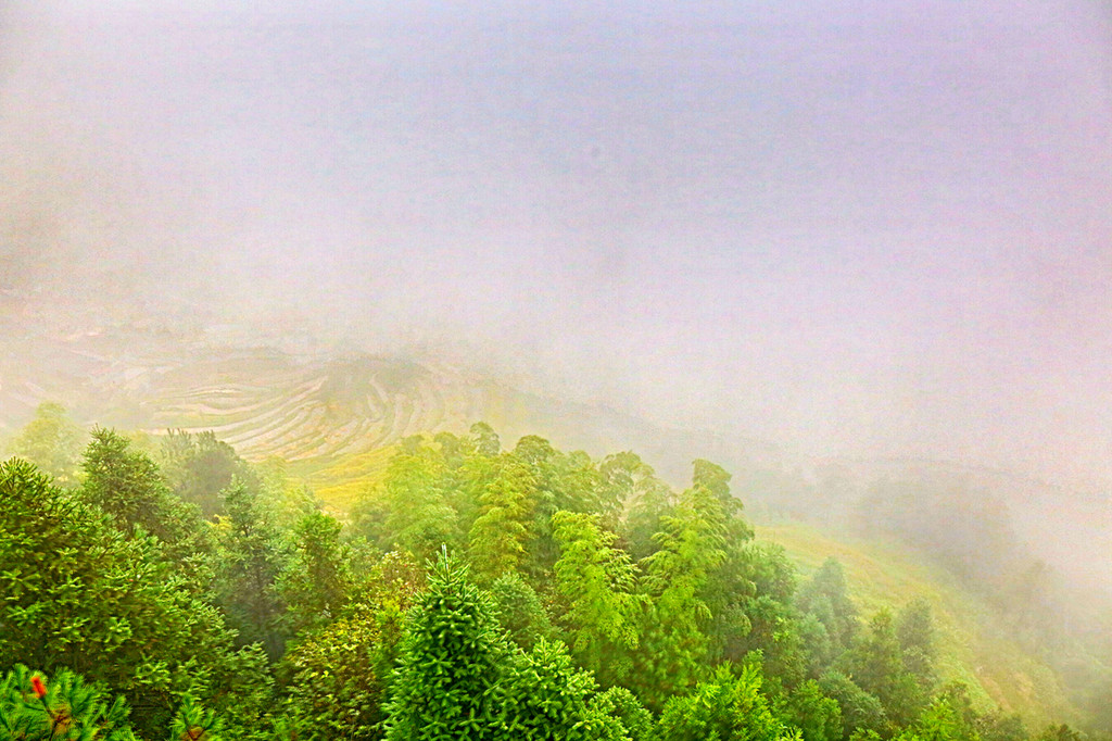 于是我们返回客栈吃早餐,完了后拿上行李退房,开车再次来到八卦冲观景台,板等雾气消散。或许是我们的人品不错,在眼见八卦冲没有希望后,我们步行向上,去了几百米之外的老马凼观景台,刚来到这里,就见风把雾气逐渐吹散,把梯田逐步展现了出来,梯田四周云雾缭绕,恍如仙境一般,我们抓紧时间来回拍摄,拍完一路小跑再次来到八卦冲观景台,可惜迟了一步,云雾再次聚拢,四周再次白茫茫一片,据留守在这里的大姐介绍,就在几分钟前,云开雾散了几分钟时间,让她们拍摄到了难得一见的美景,并从手机里展示给我们看,让我们羡慕不已。
