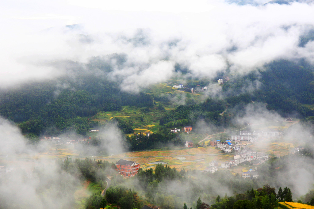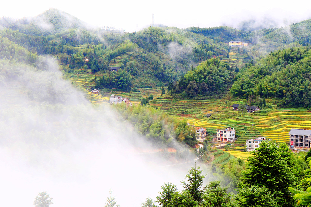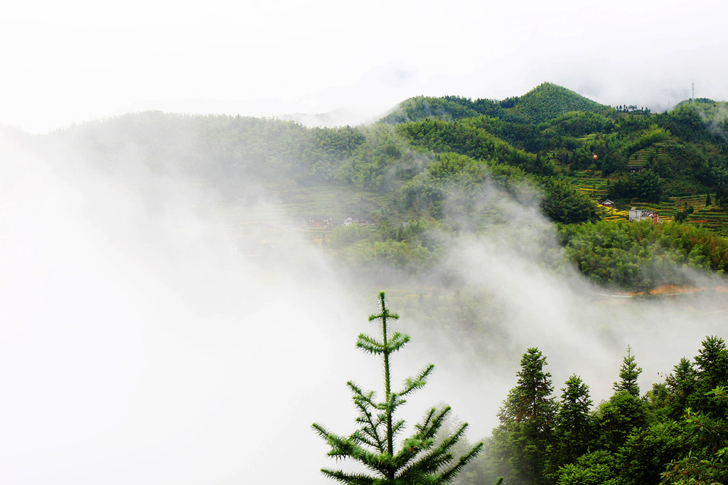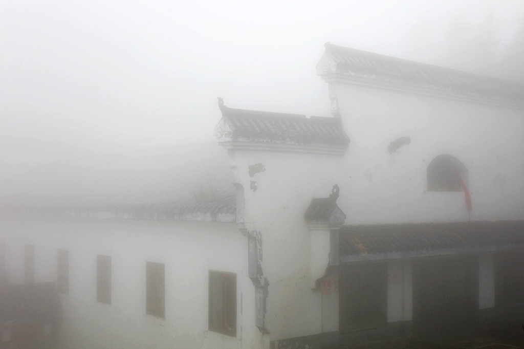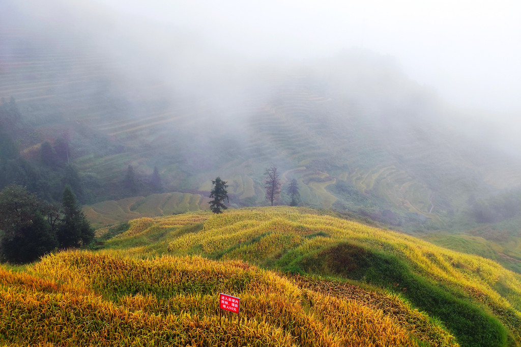 于是我们返回客栈吃早餐,完了后拿上行李退房,开车再次来到八卦冲观景台,板等雾气消散。或许是我们的人品不错,在眼见八卦冲没有希望后,我们步行向上,去了几百米之外的老马凼观景台,刚来到这里,就见风把雾气逐渐吹散,把梯田逐步展现了出来,梯田四周云雾缭绕,恍如仙境一般,我们抓紧时间来回拍摄,拍完一路小跑再次来到八卦冲观景台,可惜迟了一步,云雾再次聚拢,四周再次白茫茫一片,据留守在这里的大姐介绍,就在几分钟前,云开雾散了几分钟时间,让她们拍摄到了难得一见的美景,并从手机里展示给我们看,让我们羡慕不已。