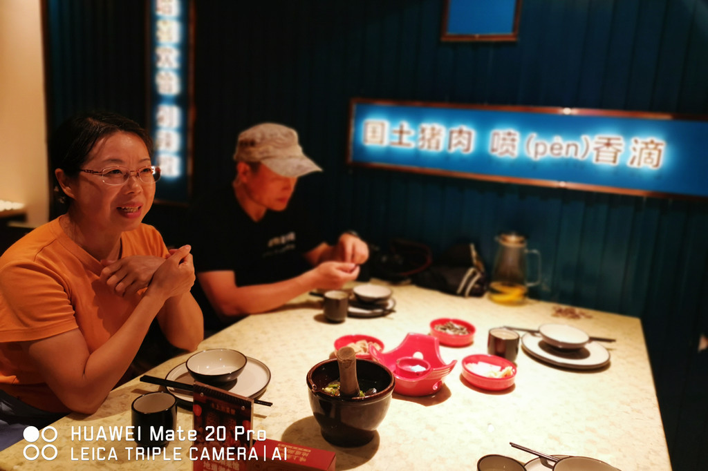 返回天子山门票站时,傍晚6点不到,虽然客栈老板娘烧的菜经济实惠,但来了张家界,岂能不尝尝著名的三下锅,于是我们找了家“华姐三下锅”店,让老板烧了几个小菜,配上啤酒,小腐败了一回。