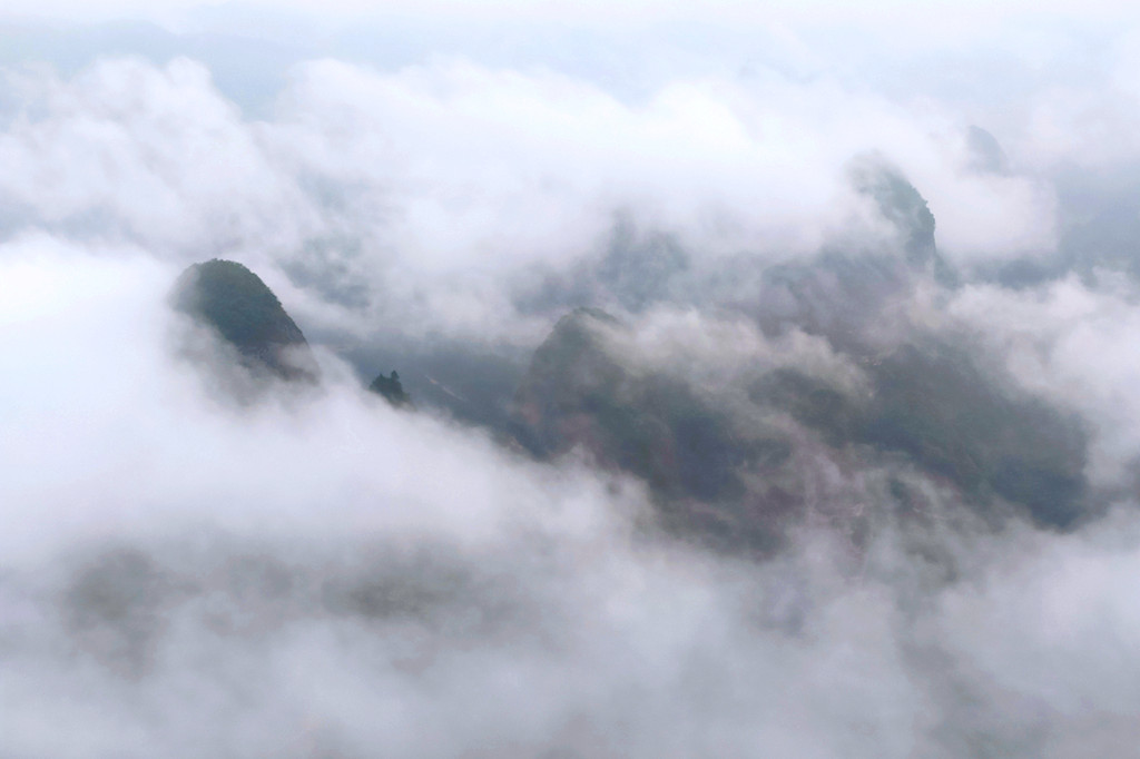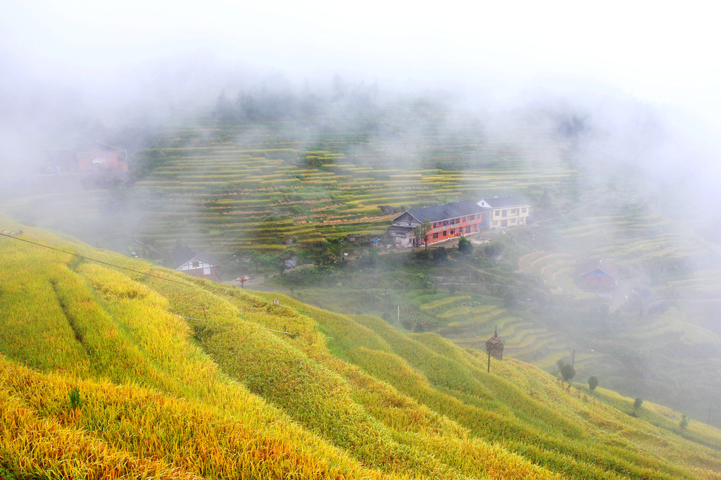 在丫髻寨,我们爬上高高的紫鹊阁,周围的梯田尽收眼底,尽管山下面云雾升腾,但山顶附近的梯田由于位置高,全部露了出来。