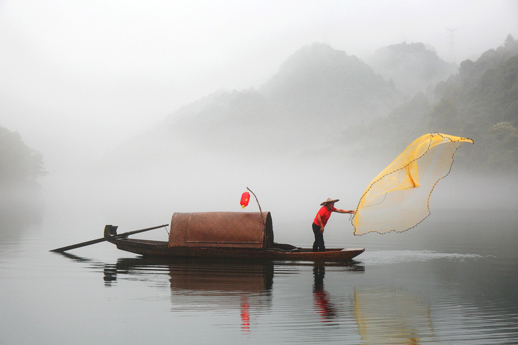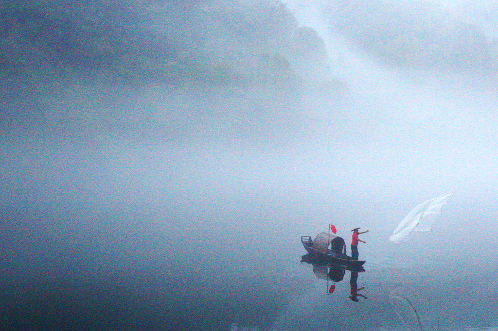 把车停在3号桥附近,我们走入观景栈道。傍晚的江面没有起雾,依然有渔夫在撒网,但意境比起早晨已经差了许多。