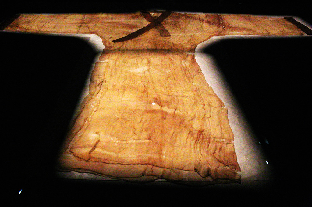 这就是著名的素纱单衣,重量仅为49克,据说共计出土了两件,后来被一个中学生盗窃,学生母亲为逃避惩罚,将其中一件烧毁,仅留下这一件孤品。此衣太过单薄透漏,不是单穿的,应该是罩在华美外衣之外的纱衣。