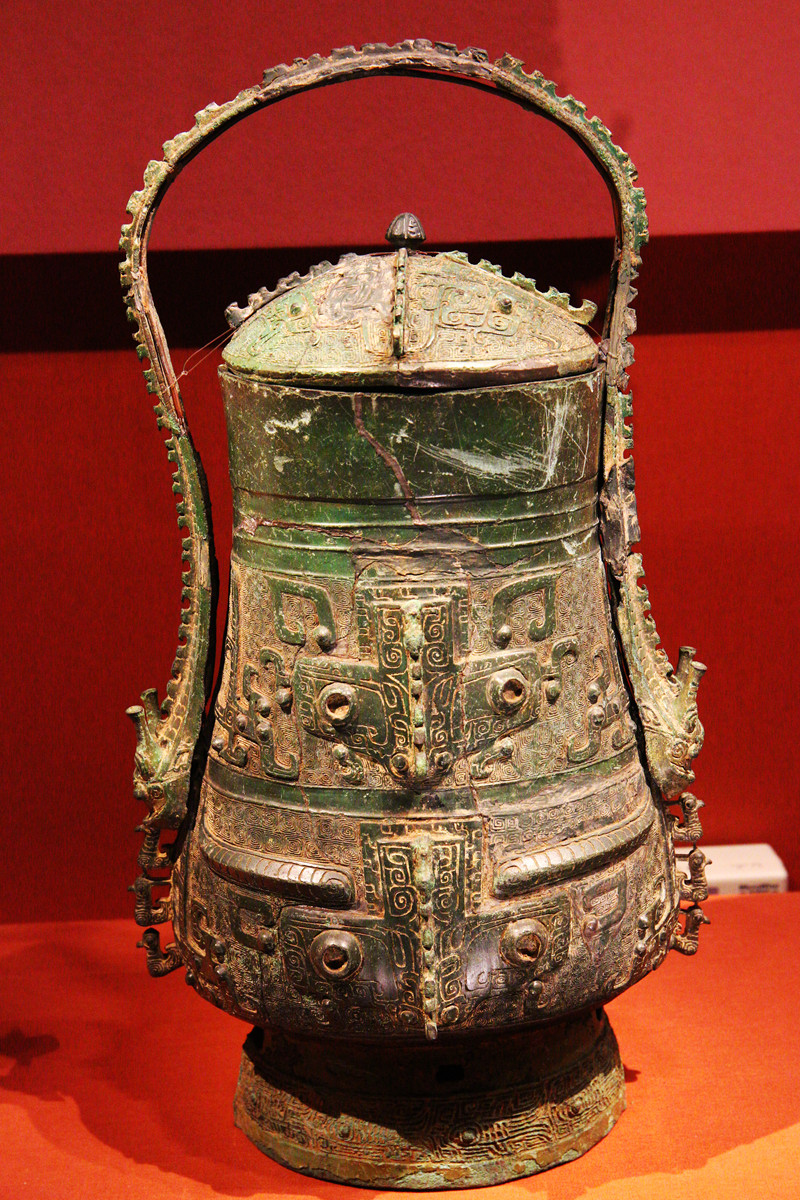《国家宝藏》中出镜的皿方罍,是博物馆的镇馆之宝,也称为方罍之王,是商代酒器。2014年盖身才被湖南省博物馆以2000万美金购回,得以“盖身合一,完罍归湘”。出土于湖南省桃源县,器盖铸有“皿而全作父已尊彝“八字铭文,呈庑殿顶形;器身全器以云雷纹为地,上饰兽面纹、夔龙纹、凤鸟纹。肩部两侧装饰双耳衔环,正面腹部下方置一兽首鋬。