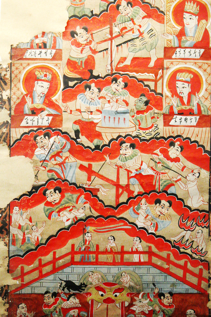 人间之下有一巨人赤身裸体,可能是地神,双手举起一白色的平台。象征着大地,平台之下,即古人统称的水府(黄泉)。