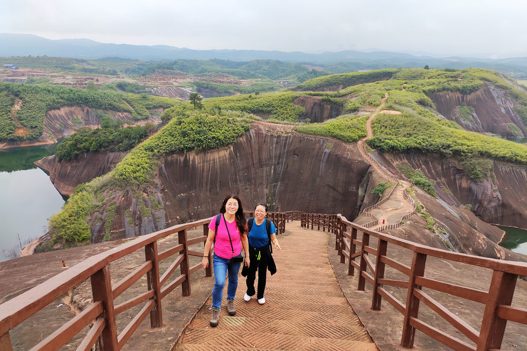 乘坐环保车来到山顶的观景长廊,然后一路下行。