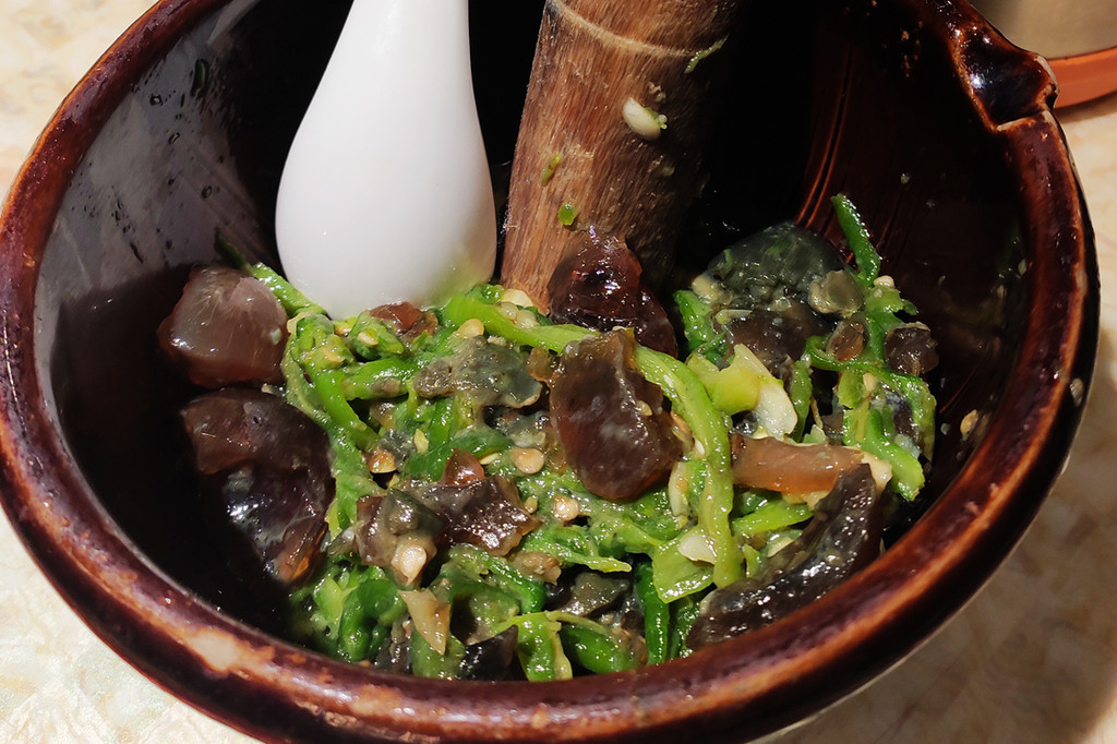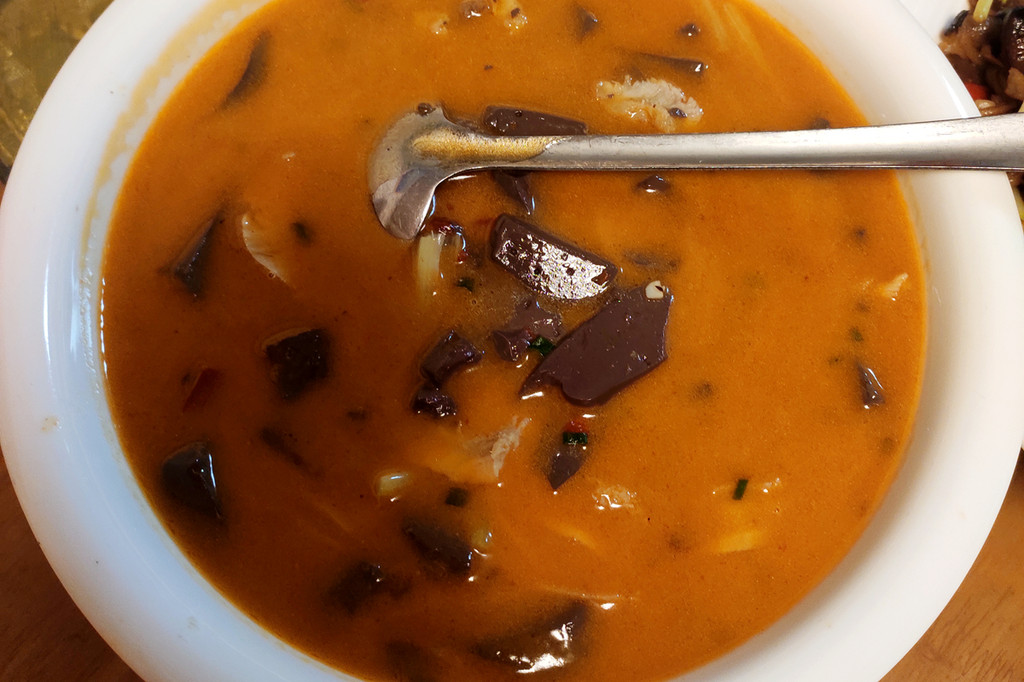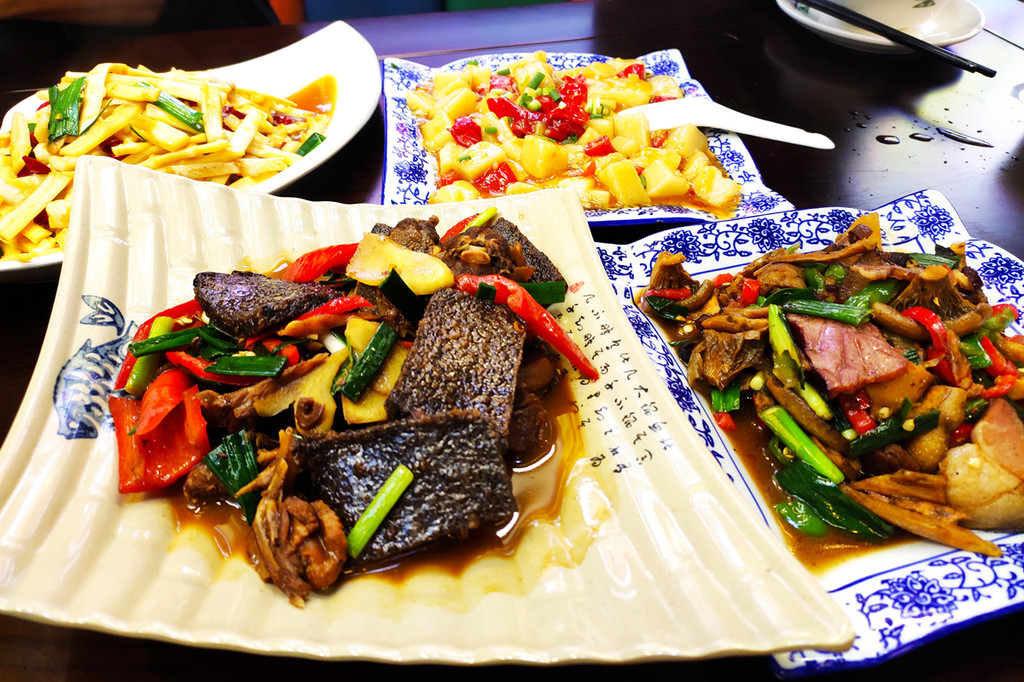 简单洗漱后,我们出门前往虹桥附近,在868湘菜馆,点了著名的血粑鸭等,血粑鸭子制作时先将预先浸泡好的上等糯米装入瓷盆里待用,在宰杀鸭子时将鸭血溶入糯米浸泡均匀。等鸭血疑固后,上锅蒸熟。冷后,将血粑切成小块,然后用油煎熟。待鸭肉煮熟时,再将血粑放入鸭肉里小煮,并掺合一定的香料,煮成金黄色即可食用。血粑鸭子既有鸭肉的鲜美味浓,又有血粑的清香糯柔,吃起来口感香浓,让人食欲大增。