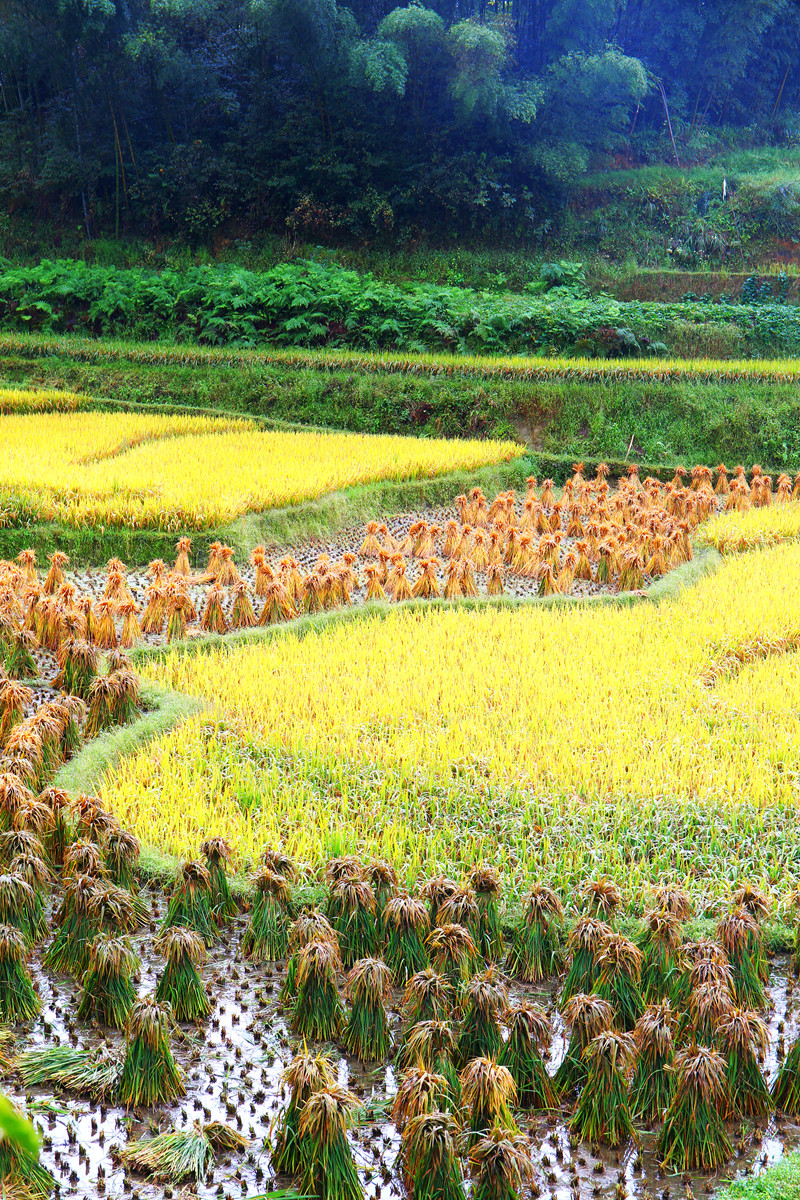 来到老屋场之后,老板大概交代了游览线路,就回去了,让我们玩结束了再联系他来接我们。我们首先从右侧沿小路下到空中田园地里,绕着走了一圈,这里稻子已经收割了一部分,地头还放着脱粒机,因为下雨,田埂非常湿滑。