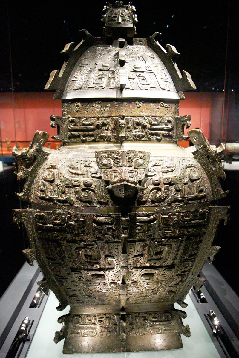 四面边角及各面中心共装饰八条突起的长条钩戟形扉棱。整器集立雕、浮雕、线雕于一身,其造型、装饰风格来源于商代宫殿和宗庙建筑。