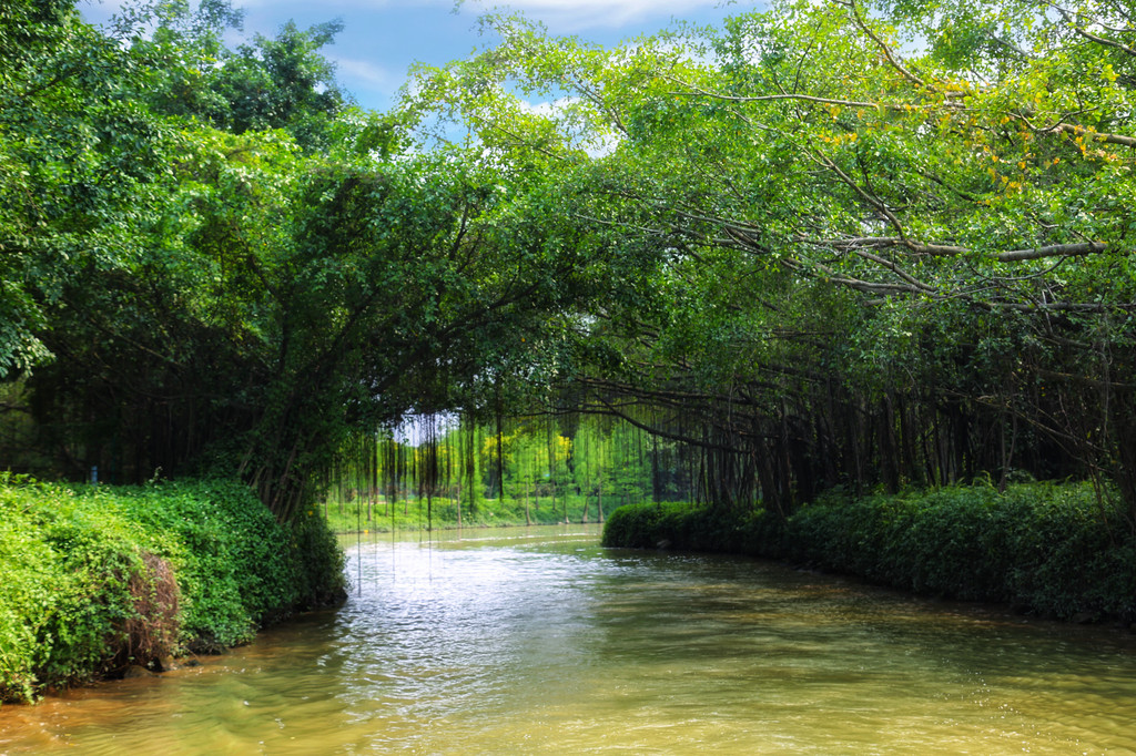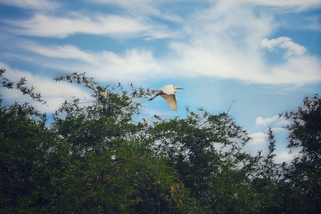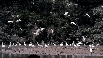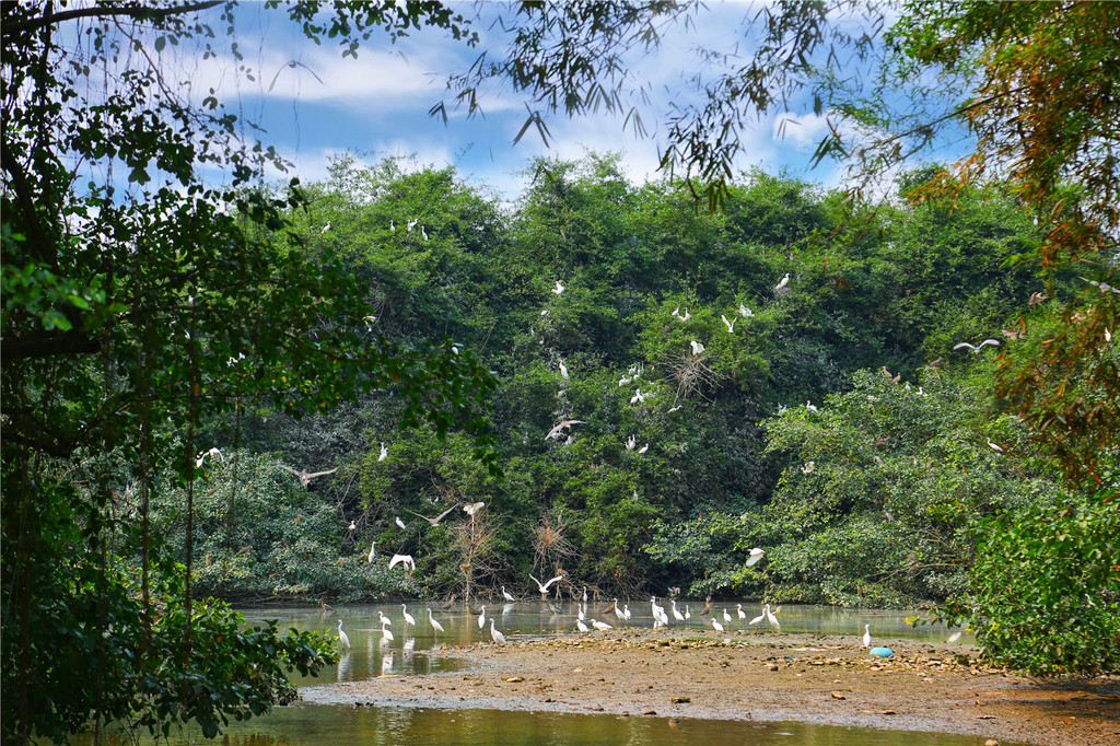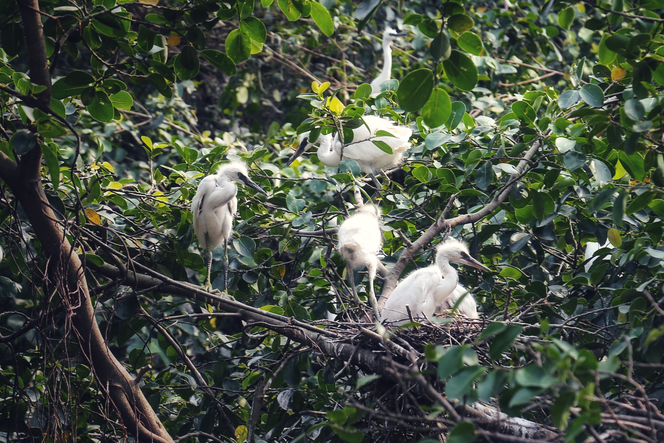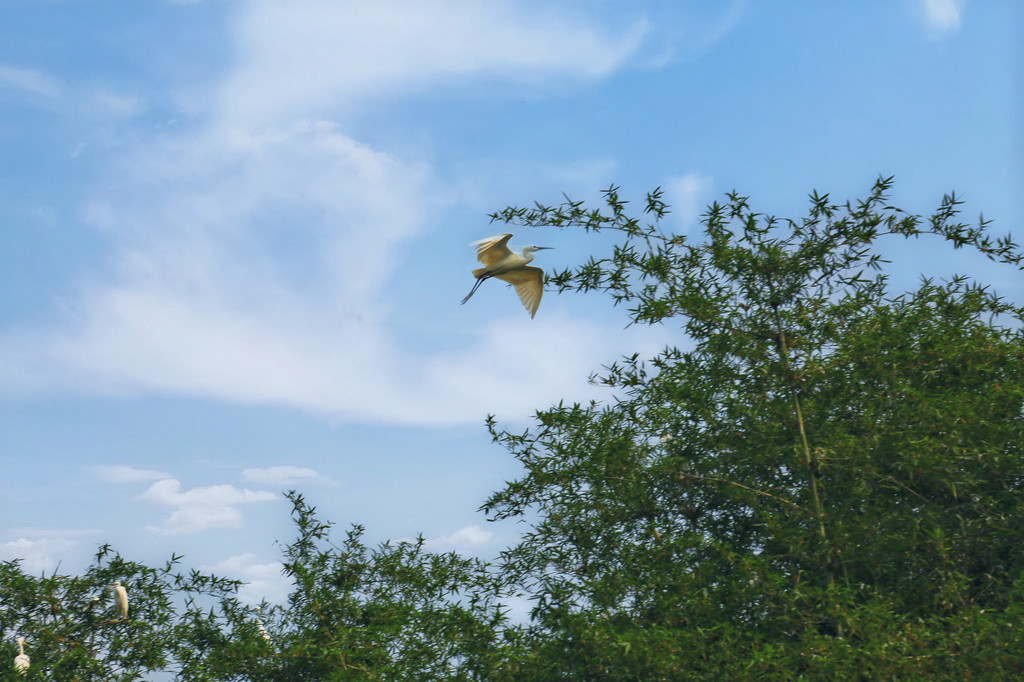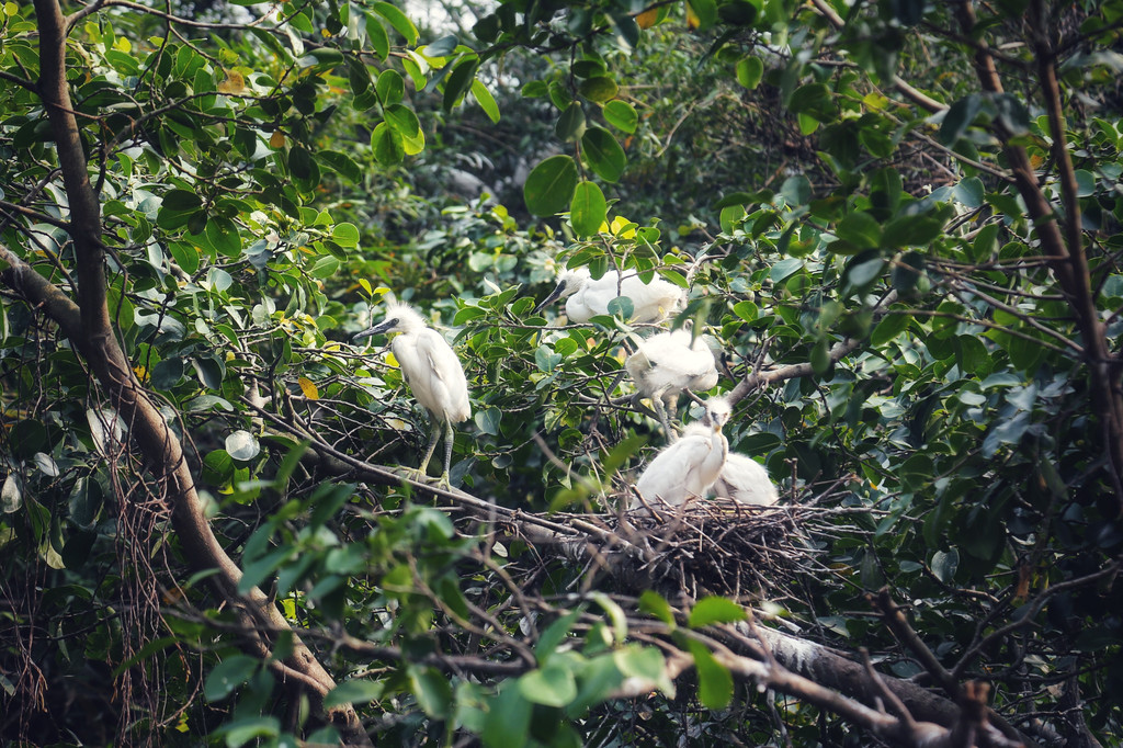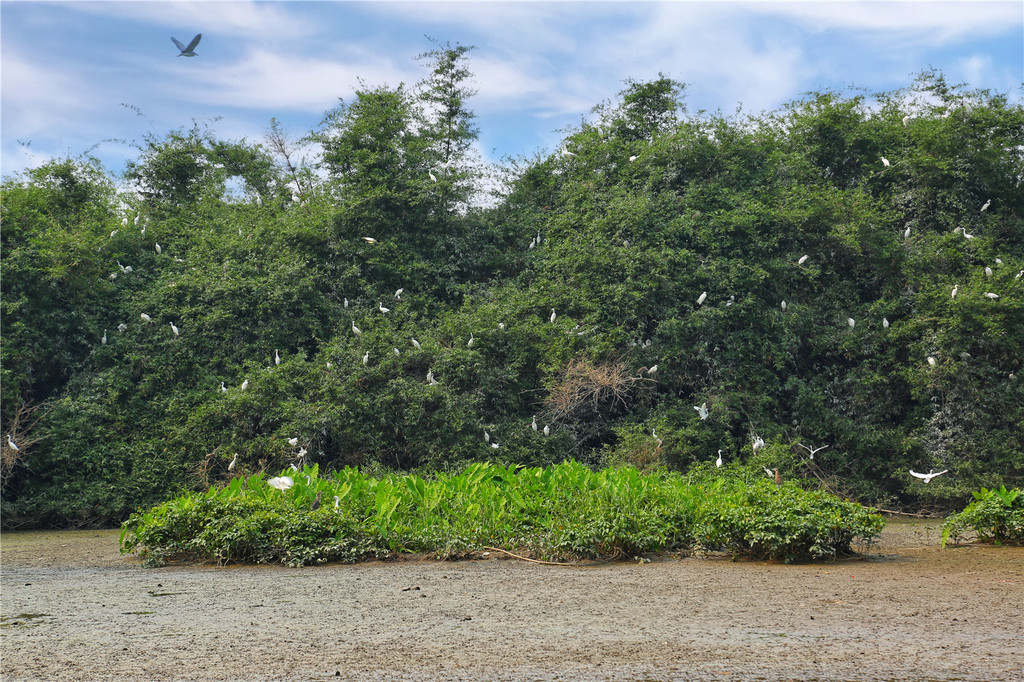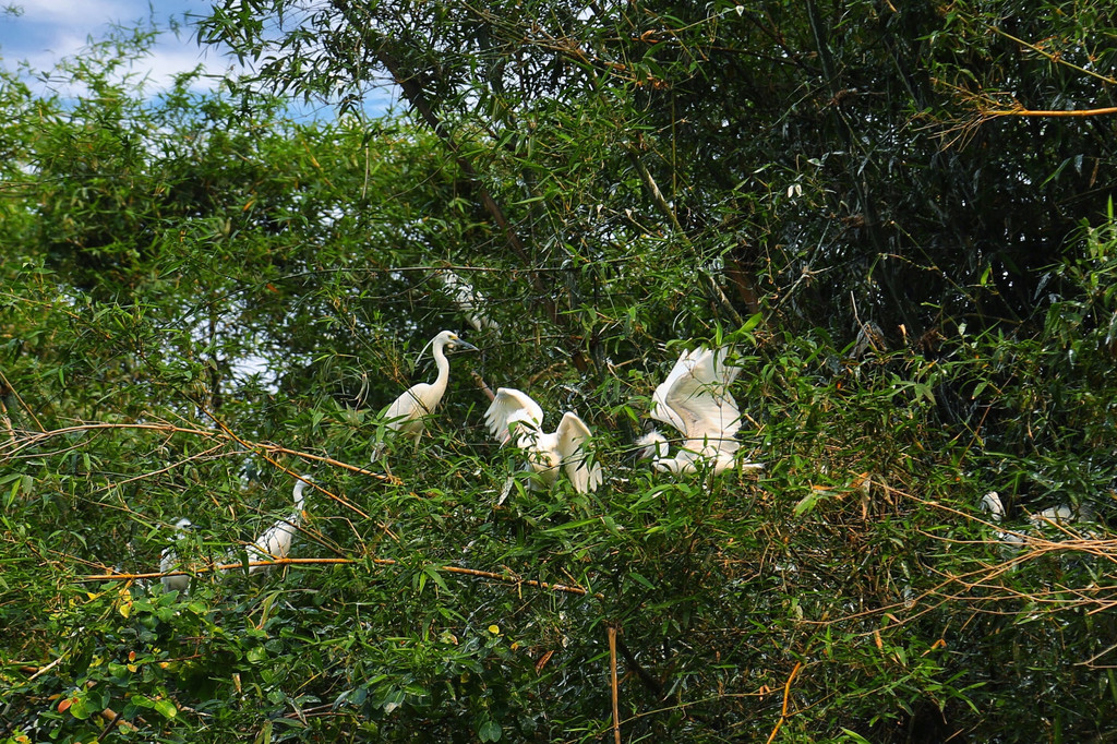 我们乘船而往,4月的风很是舒服凉爽,风吹过河面荡起了阵阵涟漪,小船经过一道又一道榕树天然形成的水道,远处树中上藏有无数或白或灰的“小点点”,认真一看,原来就是我们要找的小鸟!