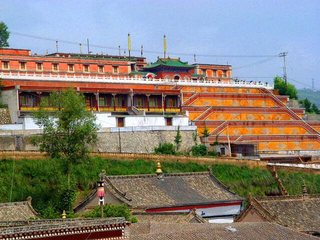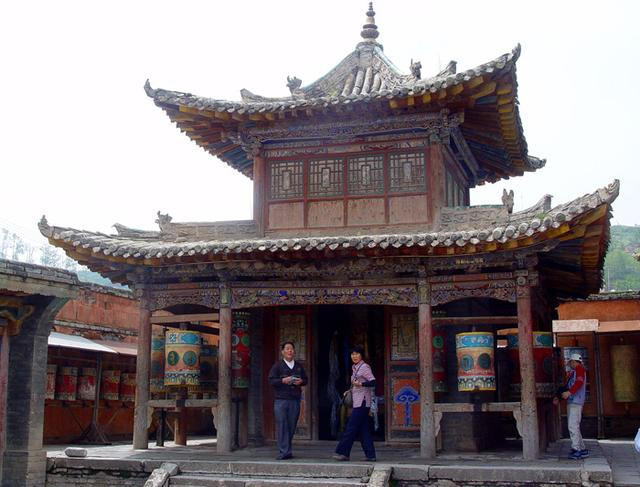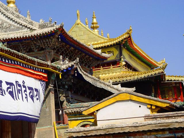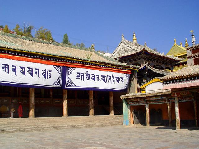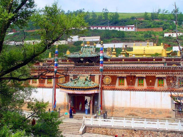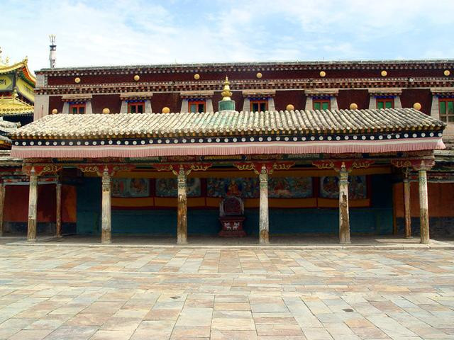 其中,大金瓦殿和大经堂为全寺主体建筑。大金瓦殿始建于清康熙年间,建筑面积456平方米,上下三层,飞檐四出,各抱形势,歇山式金顶,覆以镏金铜瓦,墙面用琉璃瓦砌成,图案精美,殿内纪念宗喀巴的大银塔,誉为“世界一庄严”,殿堂正门上方悬有清代乾隆皇帝亲题的“梵教法幢”匾额。