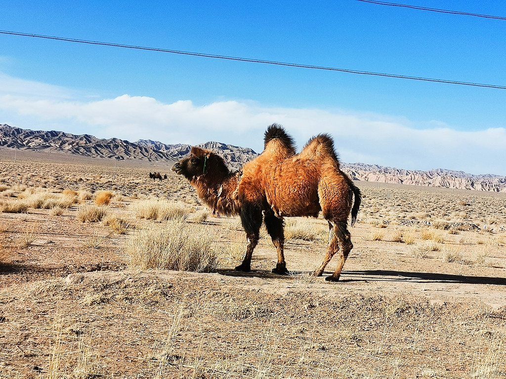 但大 西北 地广人稀,当车子笔直戳向天际的公路上,一种大漠狂野的的感觉就像电影的画面一样熟悉,喜欢这种自由放飞的快乐!有一群骆驼映入我们的眼帘。