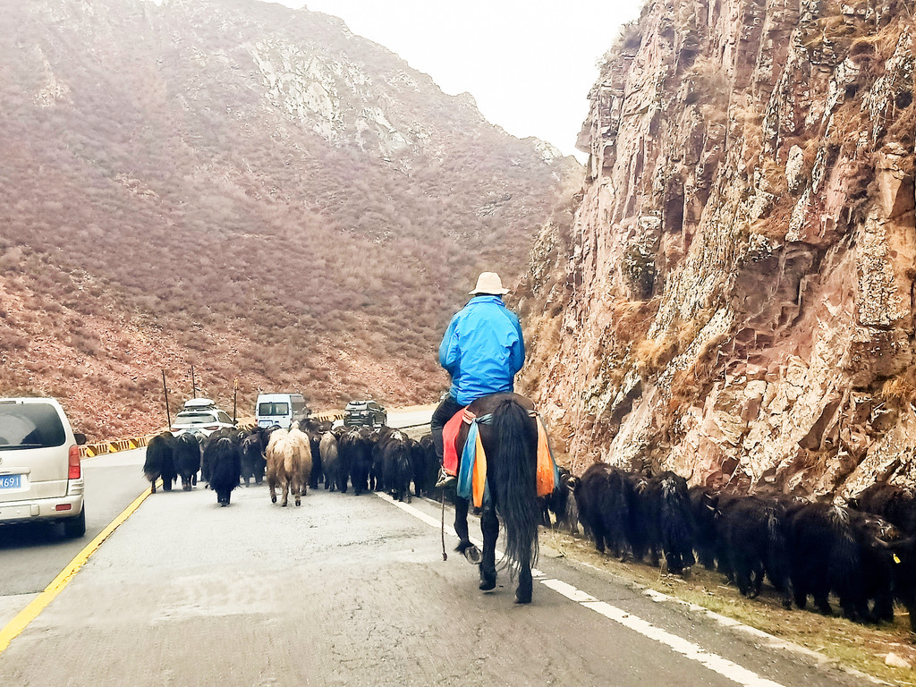 此次行程中,接近尾声的这一段,可能算是充满遗憾的,因为油菜花没有开,祁连大草原没得草,但是可以看到一群羊咩咩,还有黑色的、白色的牦牛,因为前一天晚上下雨了,气温低,祁连这边白雪皑皑,煞是好看。