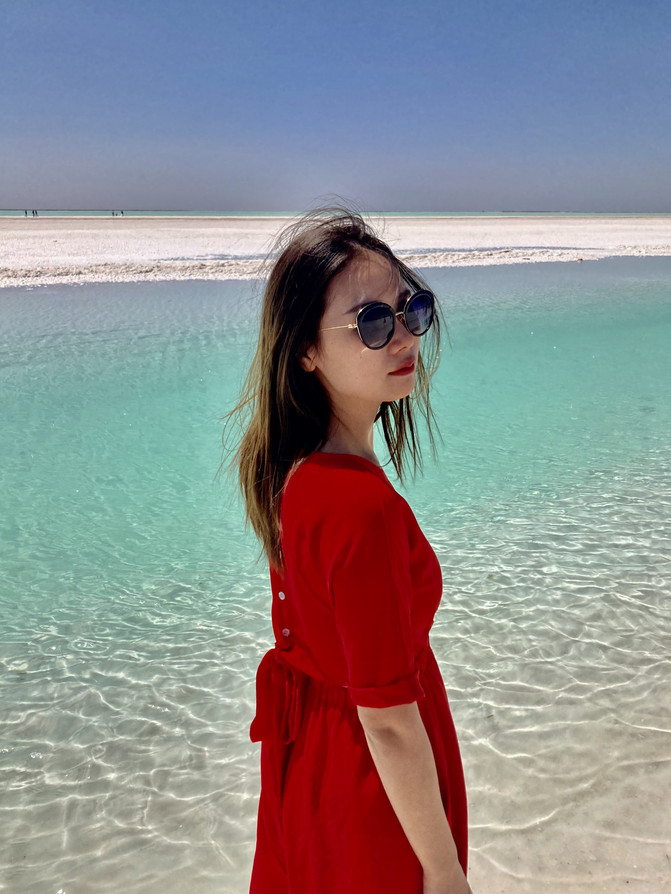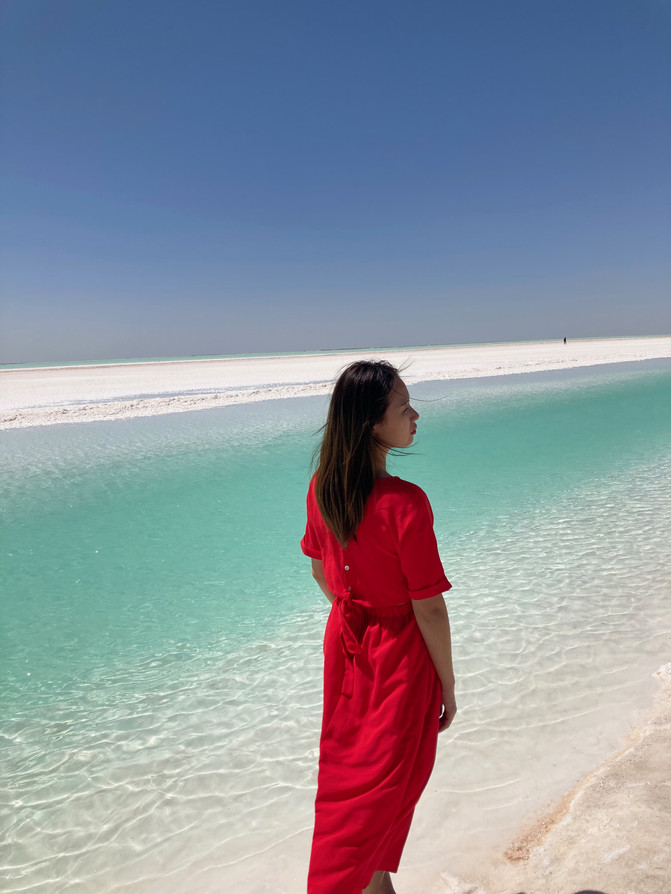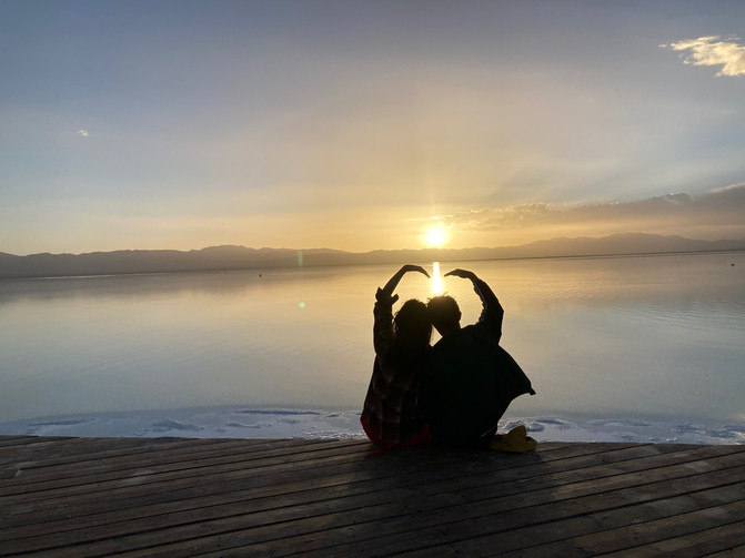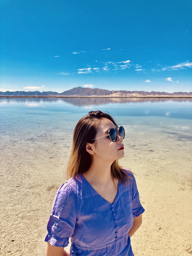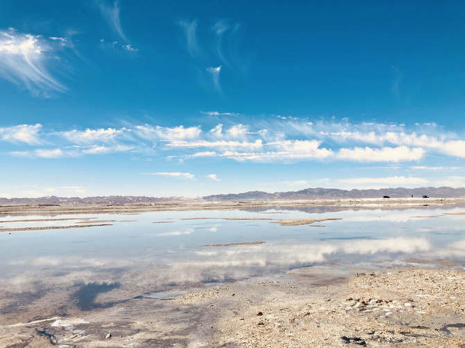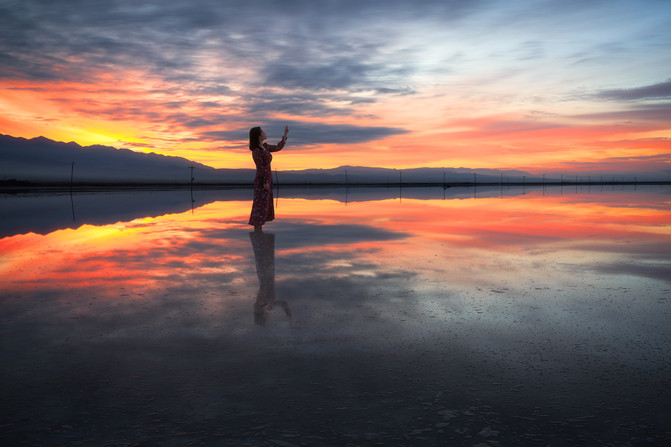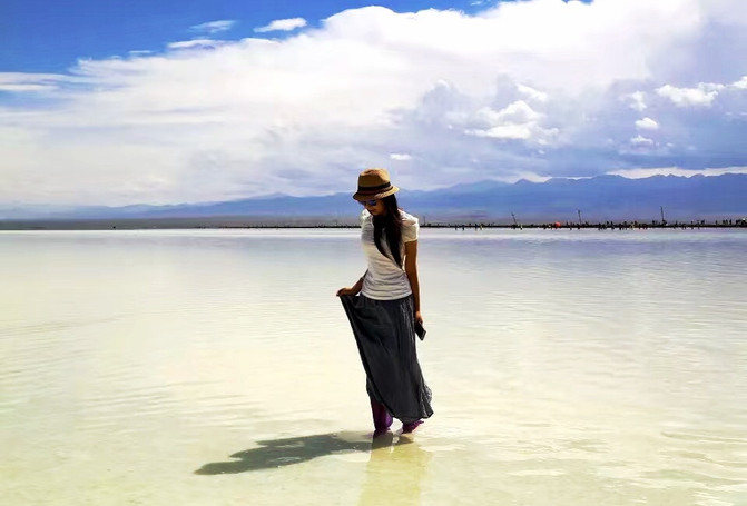 第二站是被喻为天空之境的茶卡盐湖。依然是门票和火车费,要是想节约的小伙伴可以走路进去一路拍风景。茶卡盐湖的湖面反射着阳光,如同锡制的房顶,我们去的那天阳光灿烂的过分,天空也蓝的过分,一朵云从太阳面前飘过,湖面立刻从银色变为灰色。我们站在湖面上,湖水拍打着我们的脚踝,像舌头舔舐自己的嘴唇一样轻柔。在茶卡的日落也同样震撼,想去的小伙伴们可以在拍完日落后住宿茶卡最好,这样可以在充分感受茶卡美的同时也不会感觉太累,但因为我们的行程第二天要去东台乃吉尔湖和水上雅丹,所以晚上赶了路,到了德令哈住宿。