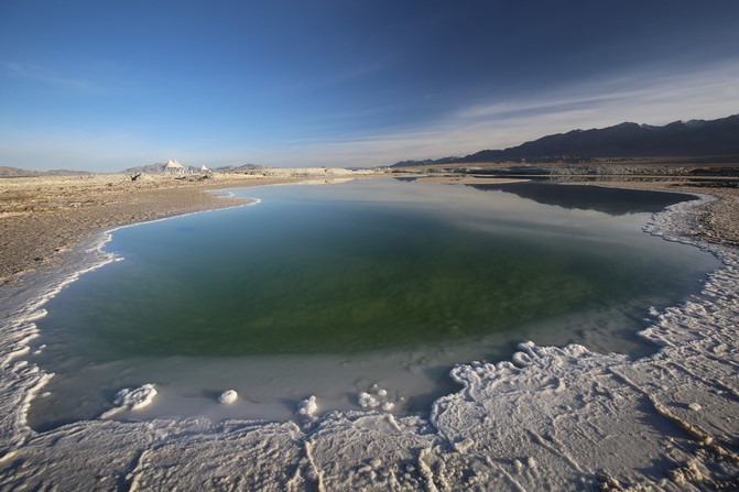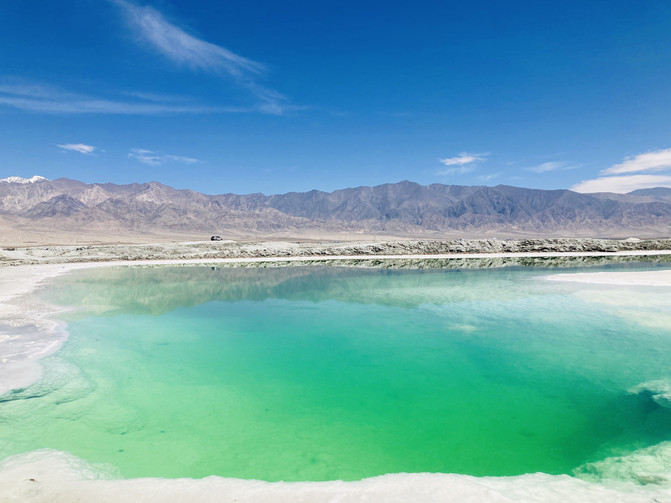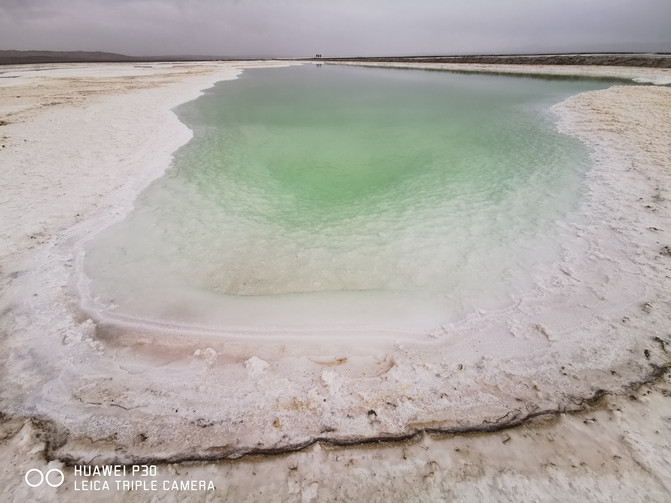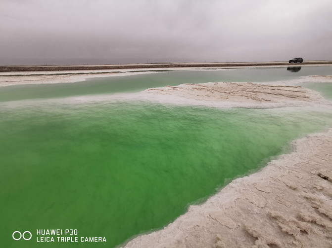 第二站来到了被誉为东方马尔代夫之称的东台乃吉尔湖。这个景点是我印象中唯一不收门票只收停车费的景点,还没有完全开发,但我认为它要比茶卡盐湖还要美,这个湖碧绿的湖水上覆盖着白色结晶的湖泊,是柴达木盆地里重要的盐湖。东台吉乃尔湖的颜色与青海湖和茶卡盐湖不同,由于含铜量较高湖水呈现出鲜绿的颇色。在阳光的照耀下美的无法形容。同样这种美景需要有一定的摄影水平才能拍出她的美。我在网上看过关于东台乃吉尔湖最近才红的原因,据说之前这个湖的颜色不是绿色,很普通,由于近几年的地质作用才变成这样,所以很可能她能变的非常惊艳,同样就能归于平淡,所以想去的小伙伴们要抓紧时间了,有美的风景就要去看,有喜欢的人就去追,有想去的远方就去。