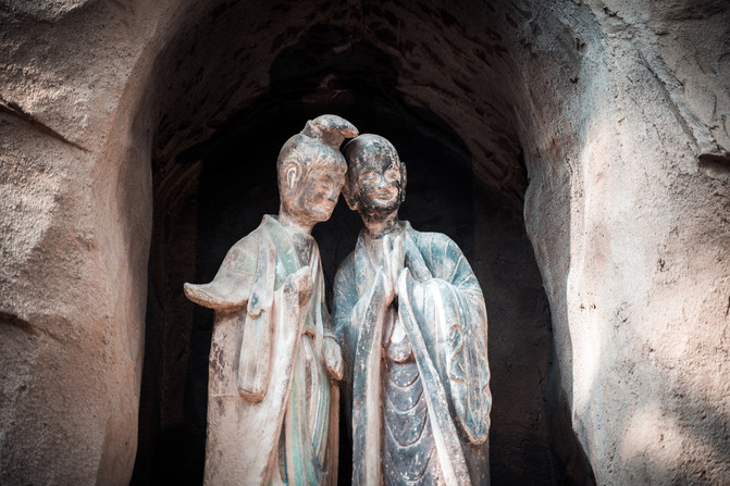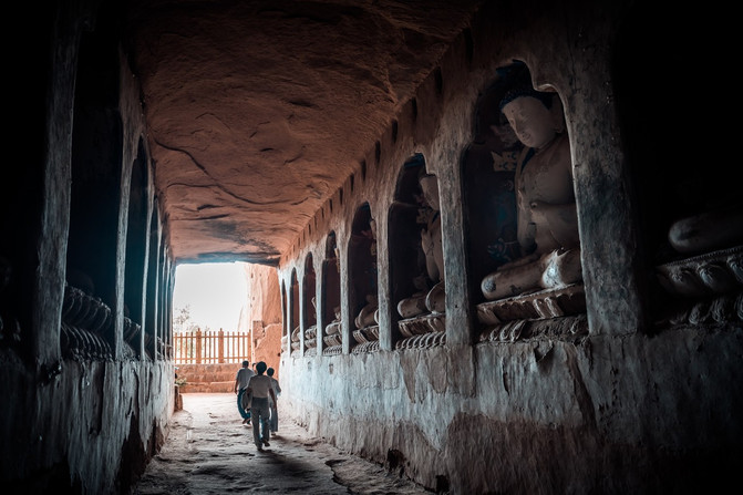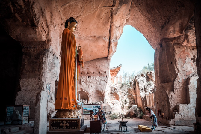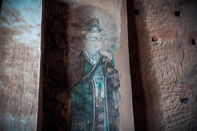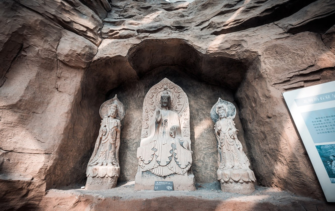 中间的坐佛恬静安祥,两侧的胁侍 菩萨 身姿优雅,气度端庄。介绍说,天梯山石窟是盛唐造像中的精品,属于唐代“丰肌秀骨”的典型作品,和莫高窟唐彩塑 菩萨 有异曲同工之妙,在艺术价值和历史价值上完全可以与莫高窟唐塑造像齐名,因为数量比较少,更显得弥足珍贵。蹲下身看,你还可以看见佛像在向你微笑。