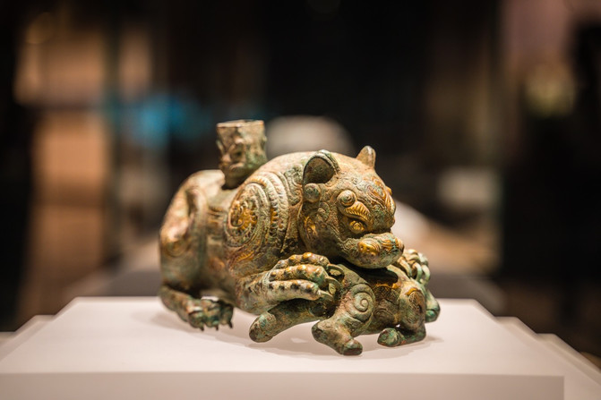 青铜鎏金虎噬羊形底座,虽然是冰冷的青铜器,但在细节上却表现得很完美。尤其是虎头的造型,2500年前的秦国工匠用了非常夸张的手段,突出了虎头,虎头几乎占据了整个雕塑的三分之一,而虎嘴的造型则占去了虎头的一半。可见先秦的工匠们非常高超的铸造技艺。
