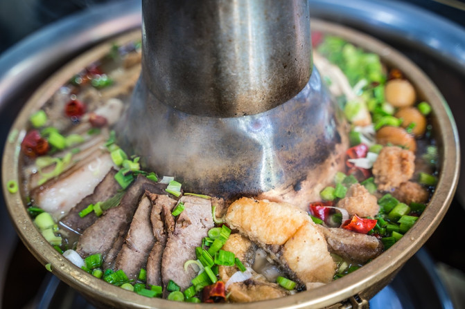 青海 的土火锅 和平 时大家所食用的火锅略有不同,采用牛羊肉熬煮的高汤作为汤底加入少许酸菜提味,端上桌时,主要食材已经在锅内整齐码好,并且基本上都是熟食,食材上部再配些许辣椒丝、葱丝加以点缀调味,看上去赏心悦目。