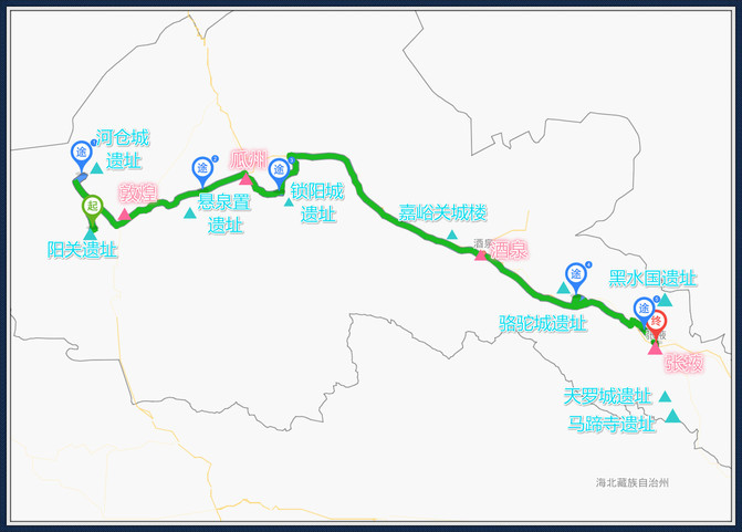 ??下半段从【 敦煌 】出发,游【鸣沙山】【莫高窟】,经【嘉峪关】到【 张掖 】,沿途寻觅【骆驼城遗址】、【 黑水 国遗址】、【天 罗城 遗址】和【马蹄寺遗址】,再从最 美国 道G227到【 西宁】,经【 兰州 】,抵达塞上 江南 -【 银川 】。