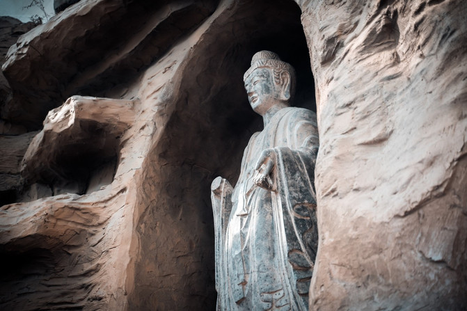 出于 天水 麦积山石窟,塑造时间是在唐代,风格与魏晋时期佛像又有了变化,从清秀走向雍容,体现唐代特有的文化气质。