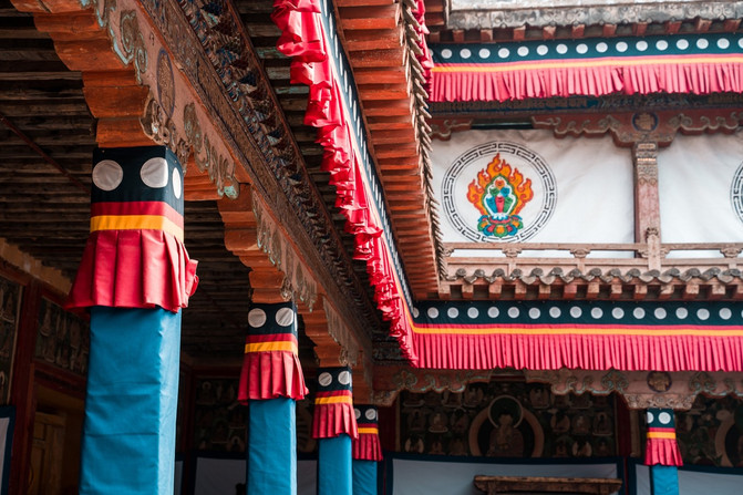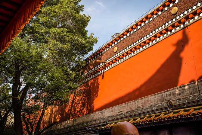 行至其主殿大金瓦殿前,游人密集得几乎透不过起来。殿前有几根粗壮的廊柱被五彩羊毛编织的藏毯包裹着,跨过高高的门槛进去,抬眼便见上方高高悬挂着乾隆皇帝御赐的金匾“梵教法幢”四个字硕然生辉,而眼前那些镀金的云头,滴水的莲花瓣,金刚套兽和铜铃以及屋顶的“火焰掌口”,也处处显出精致和厚重的气息来。