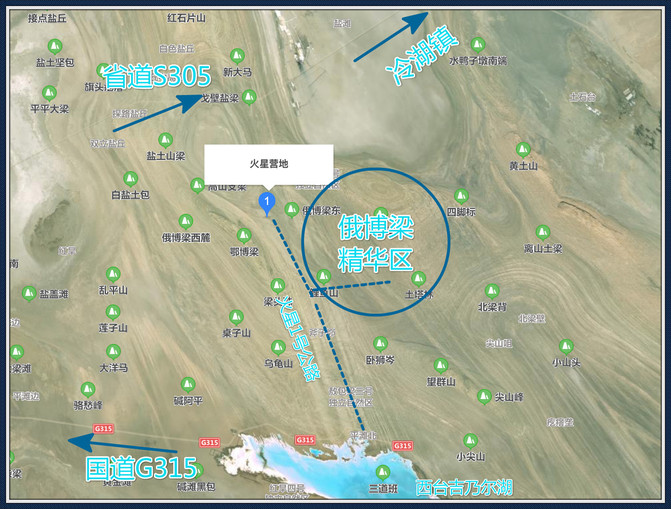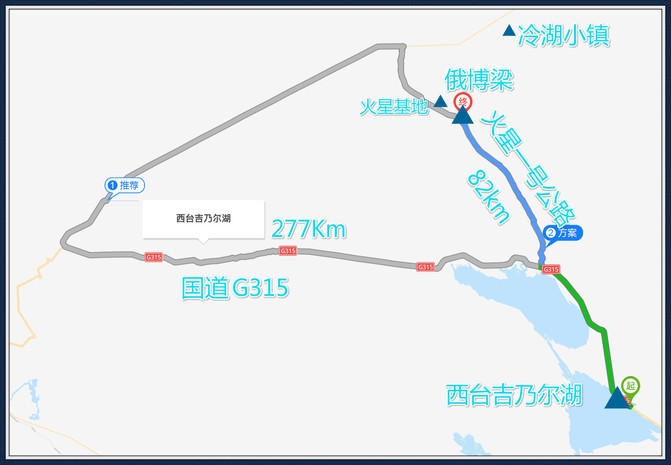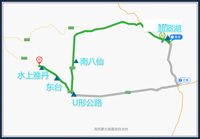??上半段从【 西宁 】出发,过【塔尔寺】,绕【 青海湖 】和【茶卡盐湖】,一头扎进 柴达木盆地 无人区,沿国道G315逐次游览【翡翠湖】、【南八仙雅丹】、【 东台 吉乃尔湖】、【水上雅丹】、【西台吉乃尔湖】,之后通过火星 一号公路 抵达【俄博梁火星基地】,最后再翻越【当金山口】来到 塔克拉玛干沙漠 ,进入【 敦煌 】绿洲。
