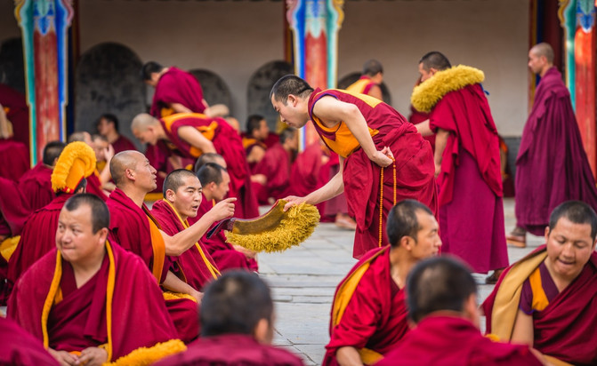 他们一方坐卧,一方站立,站立者提问是伴随击掌,振振有词,坐卧者却往往不动声色。我不懂藏语,但看到他们有的争到面红耳赤,也深受感染。