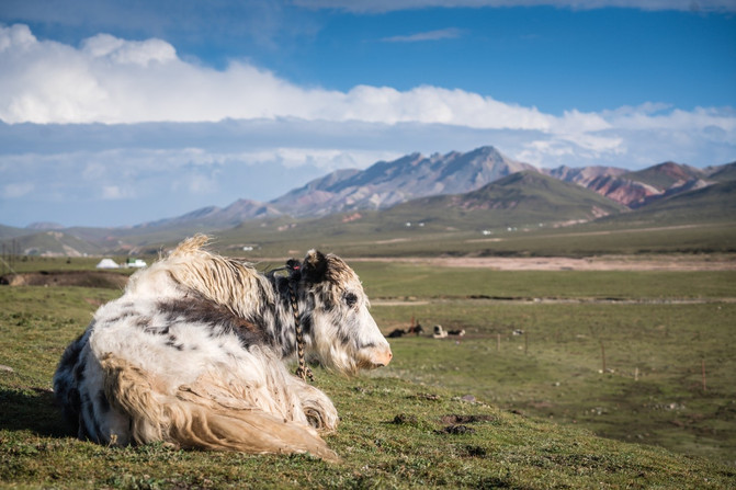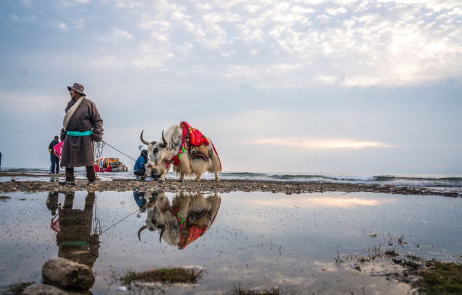 湖边有藏族同胞牵着白色的牦牛,和湖边的经幡很搭,骑一次拍照只要十块钱,倒也格外公道,毕竟这牛也是精挑细选出来的牦牛小姐,长得眉清目秀,还特别打扮了一番。