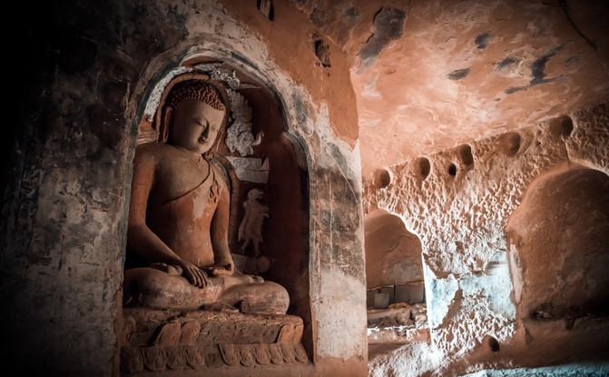 天梯山石窟彩塑坐佛和胁侍 菩萨 。