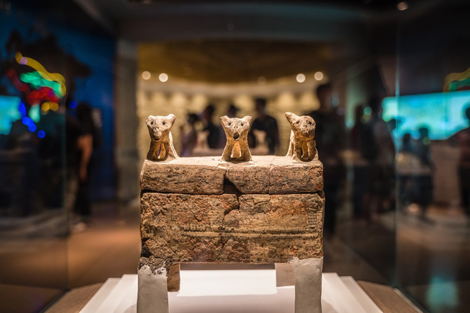 三狗纽盖彩陶方鼎,来自于火烧沟遗址,方鼎上的“狗形”雕塑,是国内文物中最早的狗之一,距今已经有4000左右年,而且一鼎三只,比龙山文化的狗形单只陶鬶,还多了两只。
