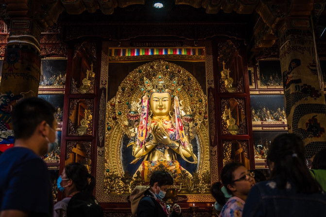 大殿四面有数不清的佛像,盒龛里,宗喀巴大师用他微笑俯瞰着熙熙攘攘的人们。