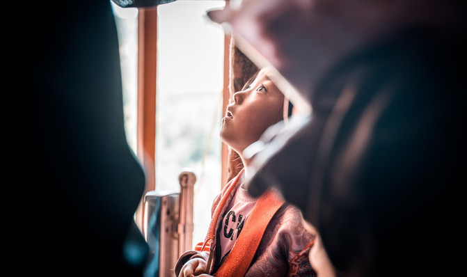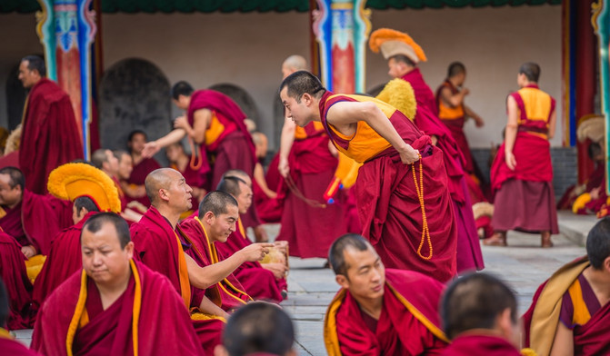 从进寺院第一眼,我的视线里不断有喇嘛出现,最老的七八十岁,最小的五六岁,他们和别的地方不大一样,似乎很悠闲,也很随意。或行走,或端坐,或聚集一起闲聊,或独自背着经文箱子穿梭于经院,却大都面色 平和 ,安之若素。大家都知道塔尔寺有“三绝”,即壁画、堆绣、酥油花,这些是静态的美,如果想要留下更难忘的一些回忆片段,那就千万别错过每天下午5-7点的辨经。