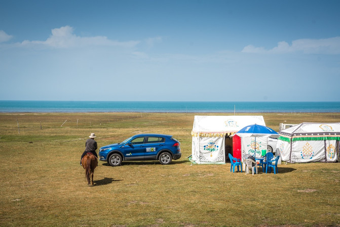 从祭海台开始到黑马河这一段,是牧民的集中区域,春夏秋三季,牧民会在这里安家,湖边是散放的牦牛和绵羊,如果你想体验人文风情,这里就最适合了,把车停进牧民家,和他们热情交流,喝喝酸奶再骑马去湖边,60元搞定。