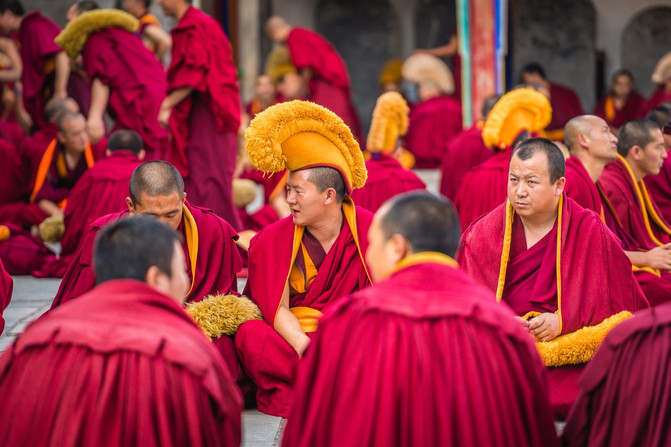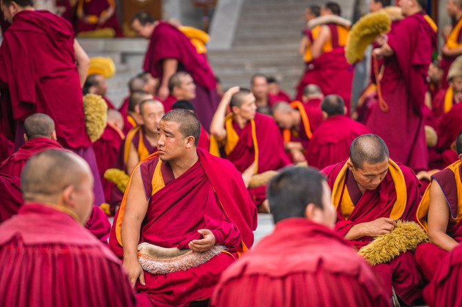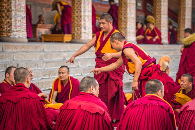 第一次看到这种场面特别新奇,如果你只听声音,更像在吵架,他们忽而高亢激昂,忽而又窃窃私语,击掌、跺脚的声响掺在其中,生动而有趣。每个辩经者风格不同,有的粗狂、有的文静、却都又那么专注用心。